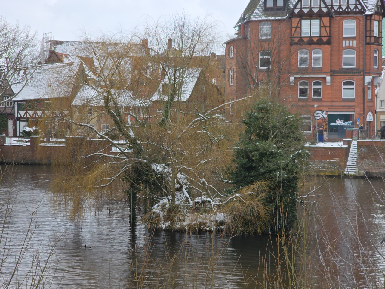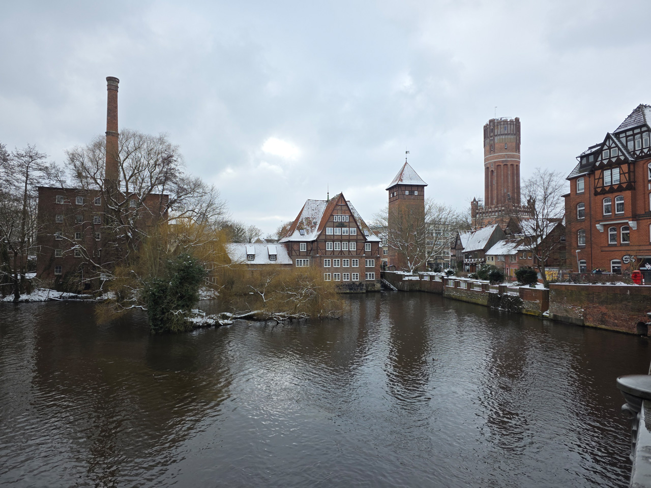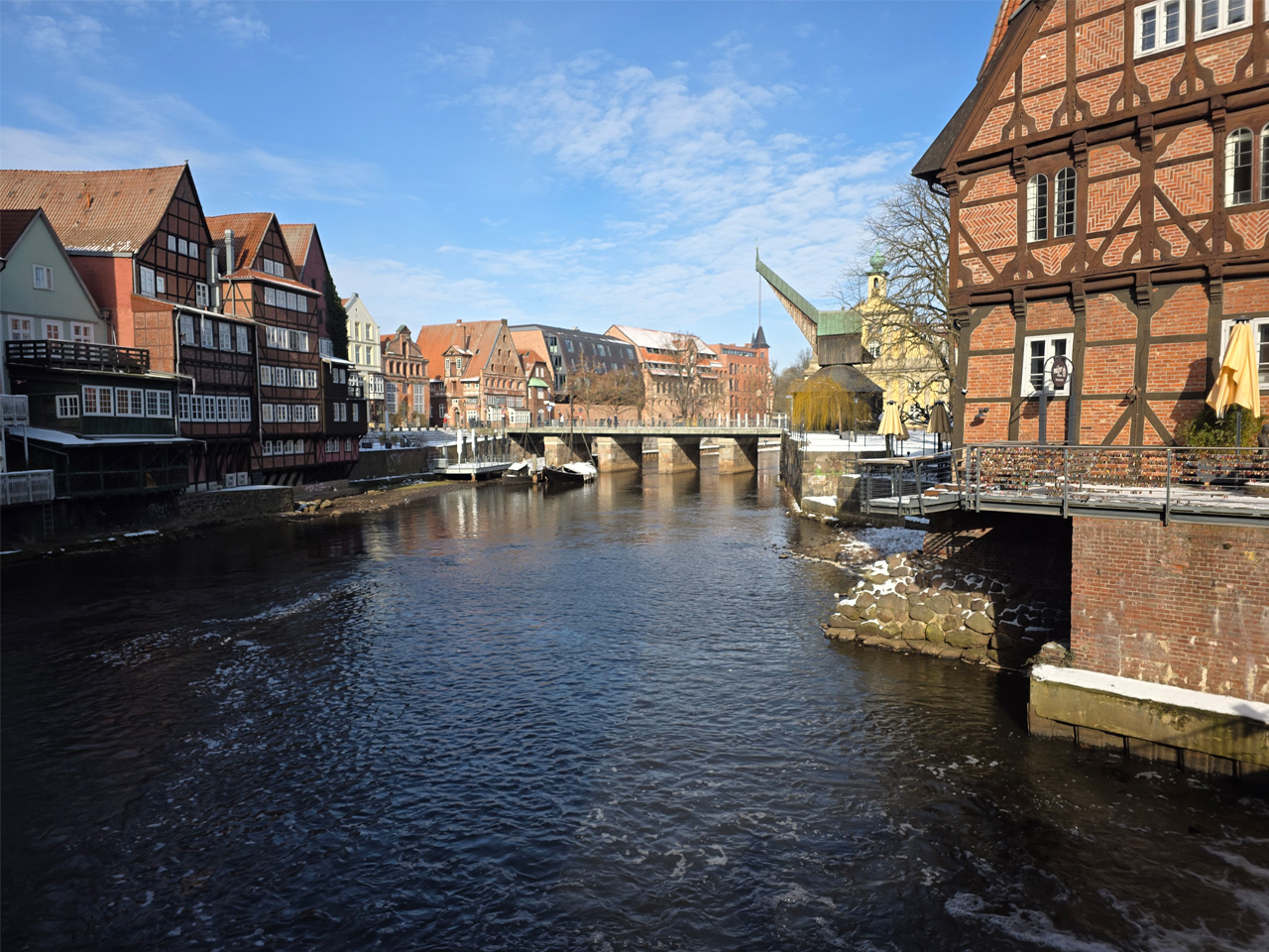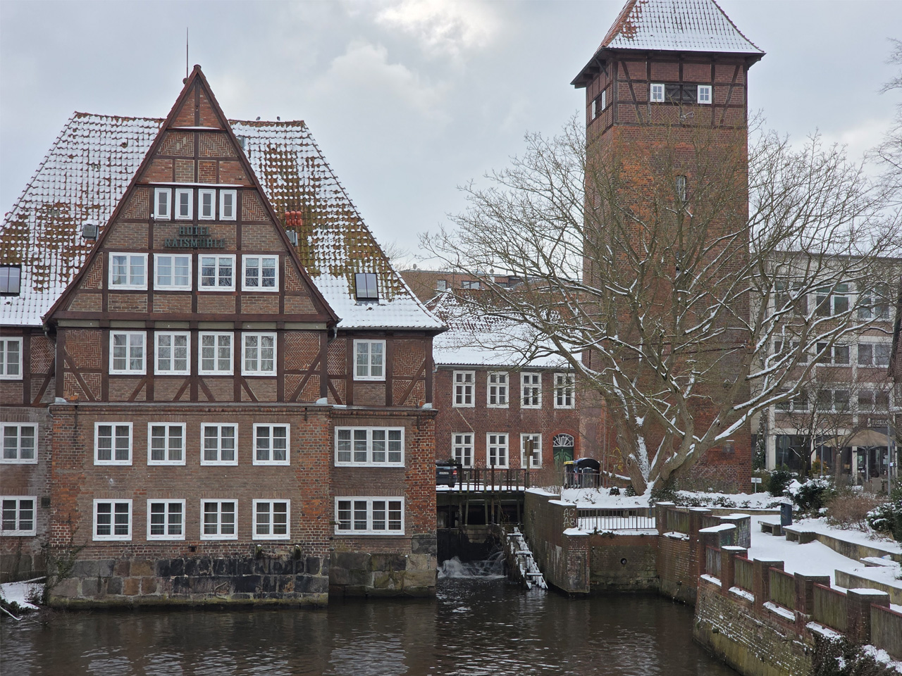Nach unserem Vormittagskaffee sind wir zu einem ersten Spaziergang in die schöne Altstadt aufgebrochen. Wir hatten 0°C Außentemperatur, was zum Tauen des Schnees führt. Die Gehwege in der Altstadt sind gut beräumt und trocken. Wir sind in Richtung Rathaus gelaufen. Auf dem Marktplatz war gerade Wochenmarkt. Uns hatte die Stadt schnell wieder in ihrem Bann. Uns faszinieren die gepflegten Backsteingebäude mit den Stufengiebeln. Die Geschäfte haben zurzeit Sale oder wie es früher hieß, Winterschlussverkauf. Galleria Kaufhof am Markt gibt es noch, sie bieten hohe Rabatte. Wir haben aber nichts gekauft, weil wir beide sehr gut ausgestattet sind. Wir sind über die Große Bäckerstraße zum Am Sande gelaufen. Zwischendurch waren wir in dem Wellensteinladen, aber auch da haben wir nichts gekauft. Ansehen darf man ja Mal. Wir sind über den Platz am Sand gelaufen. An dem türkischen Bäcker mit seinen malerisch bunten Kuchenstücken im Schaufenster kommen wir nicht vorbei. Irgendwann werden wir den Kuchen kosten müssen. In einem Bogen um den alten Wasserturm sind wir zur Ratsmühle gelaufen. Hier rauscht das Wasser der Ilmenau an mehreren Stellen in die Tiefe. Ein sehr romantischer Ort mit den vielen alten Industriegebäuden. Die meisten davon werden heutzutage von einem Hotel genutzt. Wieder über dem Platz Am Sande und von da aus in die Heiligengeiststraße sind wir zum EDEKA gelaufen. Da haben wir uns mit frischen Lebensmitteln versorgt. Jetzt war es auch nicht mehr sehr weit zu unserem Womo. Den Rest des Tages werden wir in unserem kuschelig warmen Womo verbringen.