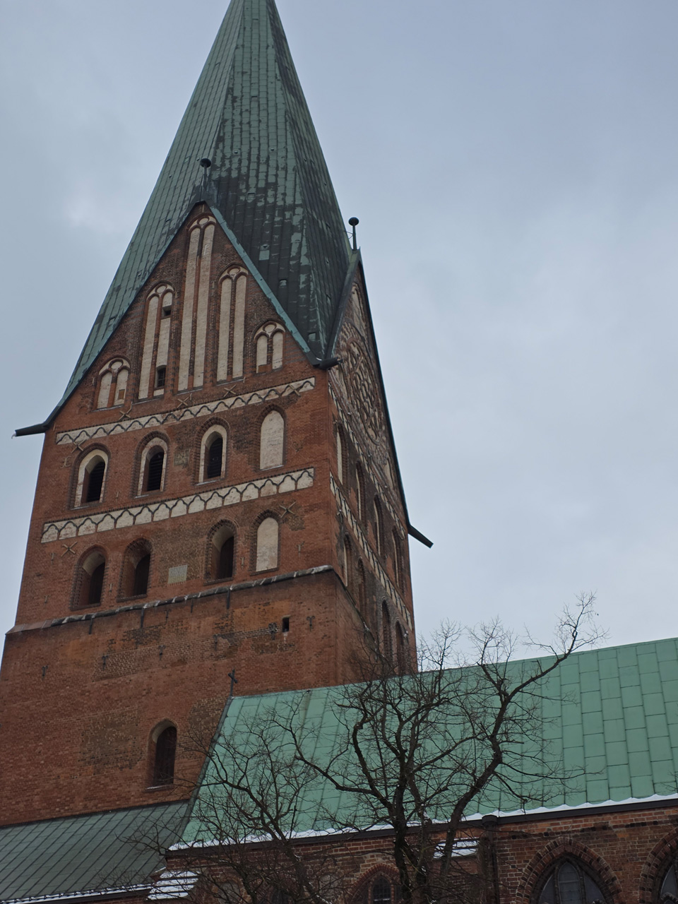 Gegen Mittag sind wir wieder losgezogen. Dieses mal sind wir als erstes zu der St. Michaeliskirche gegangen. Die war offen und so konnten wir Erinnerungen auffrischen. Von da aus sind wir zum Rathauskomplex gelaufen. Dieser Gebäudekomplex ist durch seine unterschiedliche Architektur sehr interessant und man kann dort immer wieder neue Details entdecken. Vom Rathaus und dem Marktplatz sind wir zum Stintmarkt gegangen, vorbei an der Ratsmühle. Dieser Gebäudekomplex wird heute als Hotel genutzt. Um den Stintmarkt herum sind besonders viele Gaststätten, die zu unserem Erstaunen fast alle gut besetzt waren. Von hier aus ging es zurück zu dem größten Platz von Lüneburg, am Sande. Dort sind wir in die St. Johanniskirche gegangen. Auch diese Kirche hat eine lange Historie und birgt viele Kunstschätze. Vom am Sande aus ging es über die Heiligengeiststraße zurück zu unserem Womo. Im EDEKA hatten wir einen Zwischenstopp um für unser Abendessen einzukaufen. Heute macht mein Sonnenschein nämlich Beamtenstippe, eins meiner Lieblingsessen.