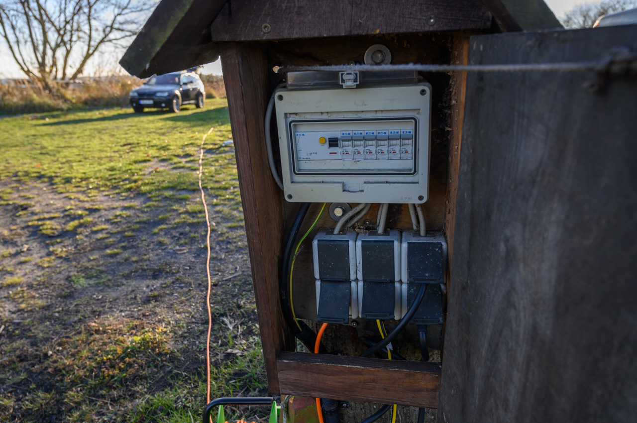- Die Stromanschlüsse befinden sich in Holzkästen mit je 8 Schukosteckdosen und einer Absicherung von 16A.