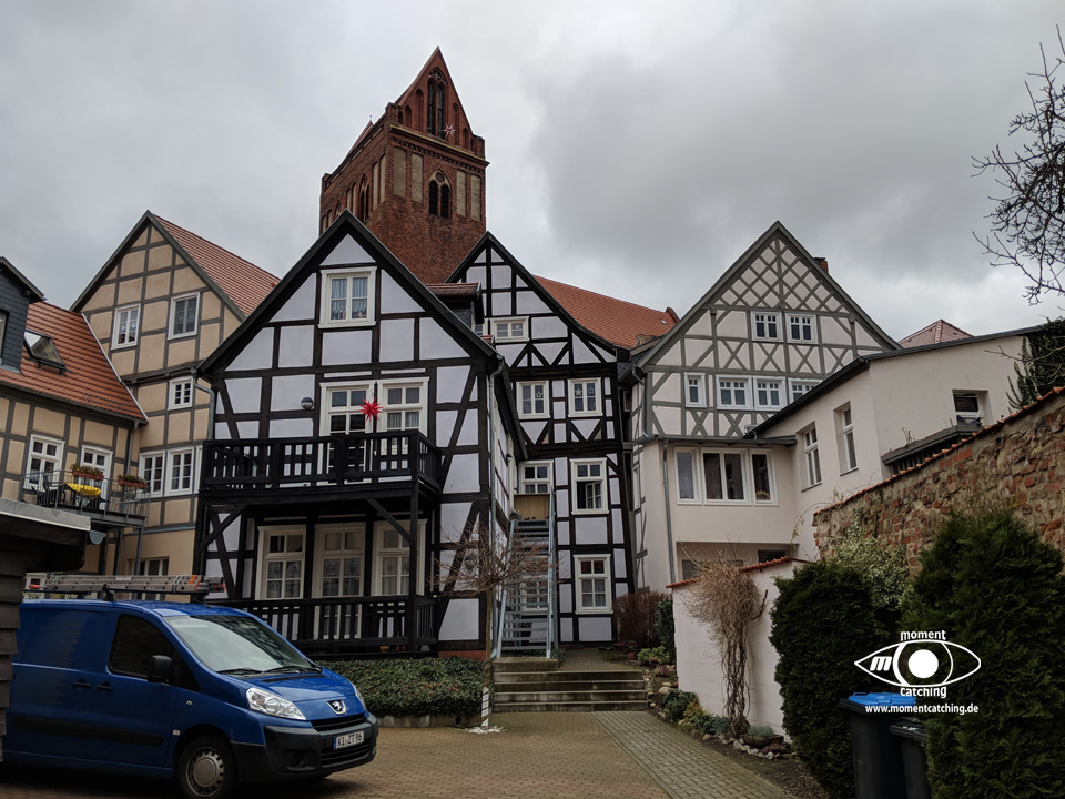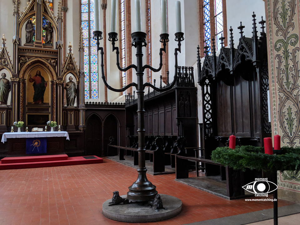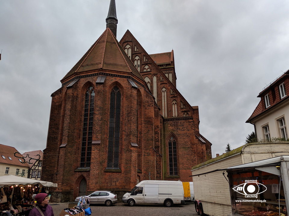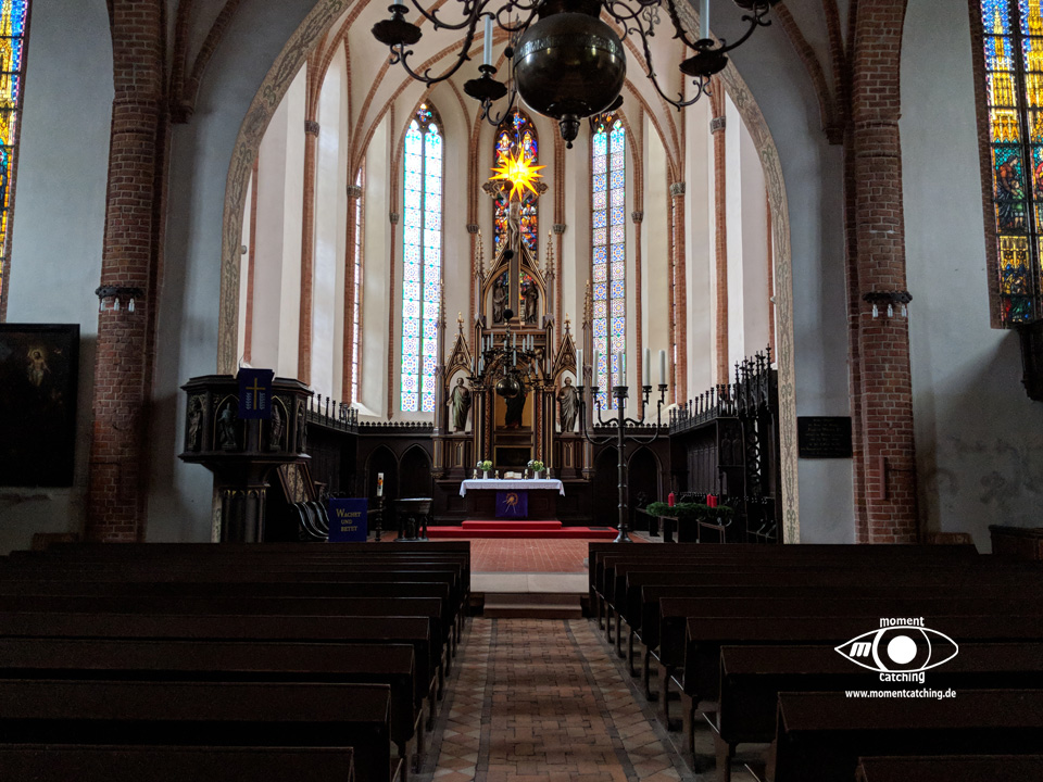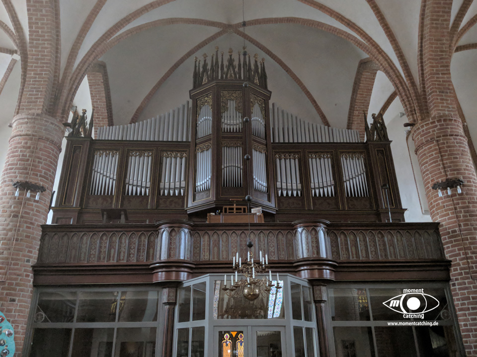 Über den Bau der St. Jakobikirche ist nicht viel bekannt. Fest steht, dass sie später als die im 18. Jahrhundert abgerissene St. Nikolaikirche errichtet wurde. Ihre ältesten Überreste sind der Turmsockel, die Ostwand mit Triumphbogen und die Fundamente des Chores, was den Schluss nahelegt, dass in der ersten Bauphase mit dem Turm und dem Chor jeweils in Feldstein begonnen wurde. Untersuchungen zu dem auffälligen Materialwechsel vom Feldstein hin zum Backstein in der frühen Bauphase lassen für den Erstbau auf einen Zeitraum zwischen 1280 und 1290 schließen. Zum ersten Mal wird St. Jakobi in einer Stiftungsurkunde von 1294 erwähnt, in der ein Heinrich Normann „den beiden Kirchen zu Perleberg eine Hebung zu Wein und Oblaten“ schenkt. Nach Ablässen für die Kirche 1295 und 1321 stifteten im Jahr 1324 die Gewandschneider und 1332 die Mariengilde jeweils einen Altar. Die dreischiffige und vierjochige Backsteinhalle, deren Grundform zwischen 1320 und 1335 entstand, bekam ihr Dachwerk in den 1330er Jahren. Von den vier heutigen Portalen des Langhauses existierte ursprünglich nur das südwestliche, das auf der Nordseite ein Äquivalent besaß. Im 15. Jahrhundert wurde das Portal auf der Nordseite offensichtlich ersetzt und zwei neue kamen im Südosten und Nordosten hinzu. Der Anbau des Chores, bei dem es sich wahrscheinlich um einen Neubau auf den Grundresten eines älteren handelt, lässt sich auf das Jahr 1361 datieren, welches sich als Inschrift an der äußeren Nordwand befindet. Vermutlich in der ersten Hälfte des 15. Jahrhunderts erhöhte man den Kirchturm und errichtete das bis heute erhaltene Glockengeschoss. Im selben Jahrhundert wurden die dreibahnigen, spätgotischen Fenster eingebaut und manche Laibungen mit Motiven wie Apostelbildern versehen. Letztere wurden aber womöglich 1912 durch Verputzen beseitigt. Weiterhin errichtete man im südlichen Bereich des Chores eine Sakristei und im nördlichen Bereich eine Marienkapelle, die jedoch zusammen mit Kapellenanbauten an der Nordseite des Langhauses durch Restauratoren nach 1850 entfernt wurden. Vom einstigen Inventar ist nicht mehr viel erhalten. Es existieren noch das gotische Chorgestühl und der Levitensitz, die beide von um 1400 stammen, sowie ein großer fünfarmiger Messingleuchter, der 1475 vom Hamburger Gießer Harmen Bonstede hergestellt wurde. Weiterhin gibt es noch Hängeleuchter im Mittelschiff, von denen einer barocken Ursprungs (1685) ist, und ein Epitaph des Bürgermeisters Konow. Der Orgelbauer Johann Friedrich Turley, Sohn des Bäckers und Orgelbauers Johann Tobias Turley, errichtete hier 1831 seine zweitgrößte Orgel mit 36 Registern. Homepage mit Öffnungszeiten und Eintrittsinformationen. |