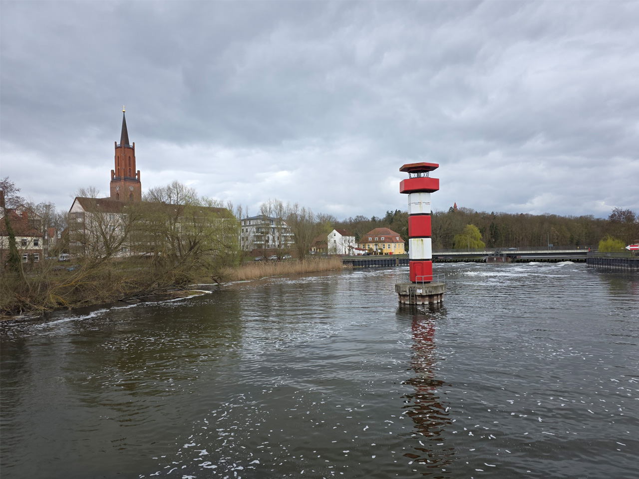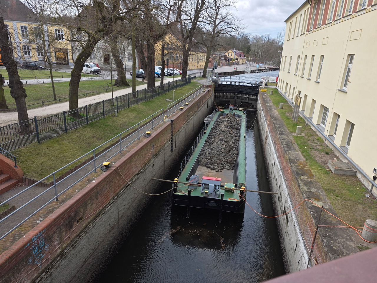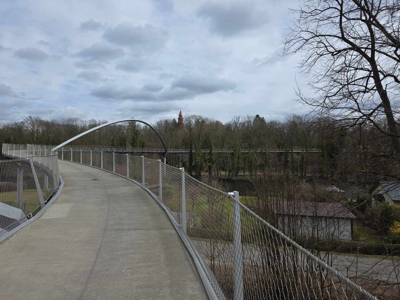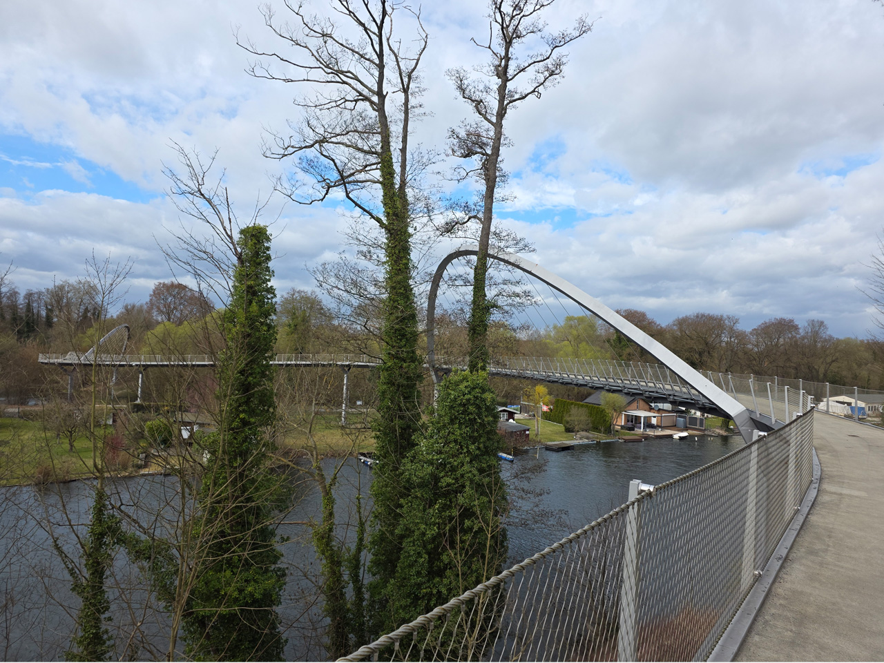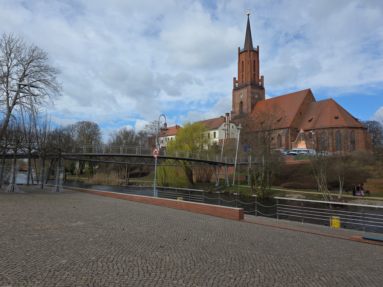 Gegen Mittag sind wir aufgebrochen zu einem Spaziergang durch Rathenow. Wir sind entlang der Stadtschleuse auf den historischen Friedhof am Weinberg zugelaufen. Die Stadtschleuse ist fast trockengelegt. Man hat anscheinend im Winter den Grund der Schleusenkammer gereinigt. Der alte Hafen, heute sowieso nur noch Sportboothafen, ist verwaist. Wir sind auf den Friedhof gegangen und haben dabei das historische Torhaus passiert. Wir sind hoch zu der Auferstehungskirche gelaufen, die aber verschlossen war. Dabei haben wir den historischen Teil des Friedhofes durchlaufen. Hier gibt es überwiegend große Familiengrabstätten, von denen die meisten einen verwaisten Eindruck machen. Das Problem wird in den kommenden Jahrzehnten immer größer werden. Diese Grabkultur hat sich in den letzten Jahrzehnten drastisch geändert, weg vom großen, festen Grab mit Stein, hin zur Urnenbestattung mit kleiner Fläche oder sogar anonymer Bestattung. Der Friedhof macht dadurch einen verwahrlosten Eindruck. Aber wer soll sich auch noch die vielen Jahr nach dem Tod um das Grab kümmern. Vom Friedhof aus sind wir zu der futuristisch anmutenden Weinbergbrücke gelaufen, die anläßlich der Buga 2015 erbaut wurde. Auf ihr überquert man in luftiger Höhe die Rathenower Havel. Am Ende der Brücke sollte man eigentlich auf das Gelände vom Optipark kommen, dass befindet sich aber noch im Winterschlaf. Alle Zugänge sind verschlossen. Wir sind aber am Brachymedialfernrohr angekommen. Man kann es sich nur aus sicherem Abstand ansehen. Wir mussten die Sportflächen umrunden und kamen am Einkaufzentrum wieder heraus. Wir sind in das Kaufland gegangen und haben unsere Lebensmittelvorräte aufgefrischt. Auf dem Weg zum Womo haben wir noch eine Schleife durch die kleine Altstadt gemacht. Die St.-Marien-Andreas-Kirche war verschlossen. Eine große Tafel informierte uns über die Neugestaltung des Inneren der Kirche. Das Umfeld der Kirche hat noch einige Bauten aus dem Mittelalter. Wir sind wieder in unserem kuschelig warmen Womo angekommen.