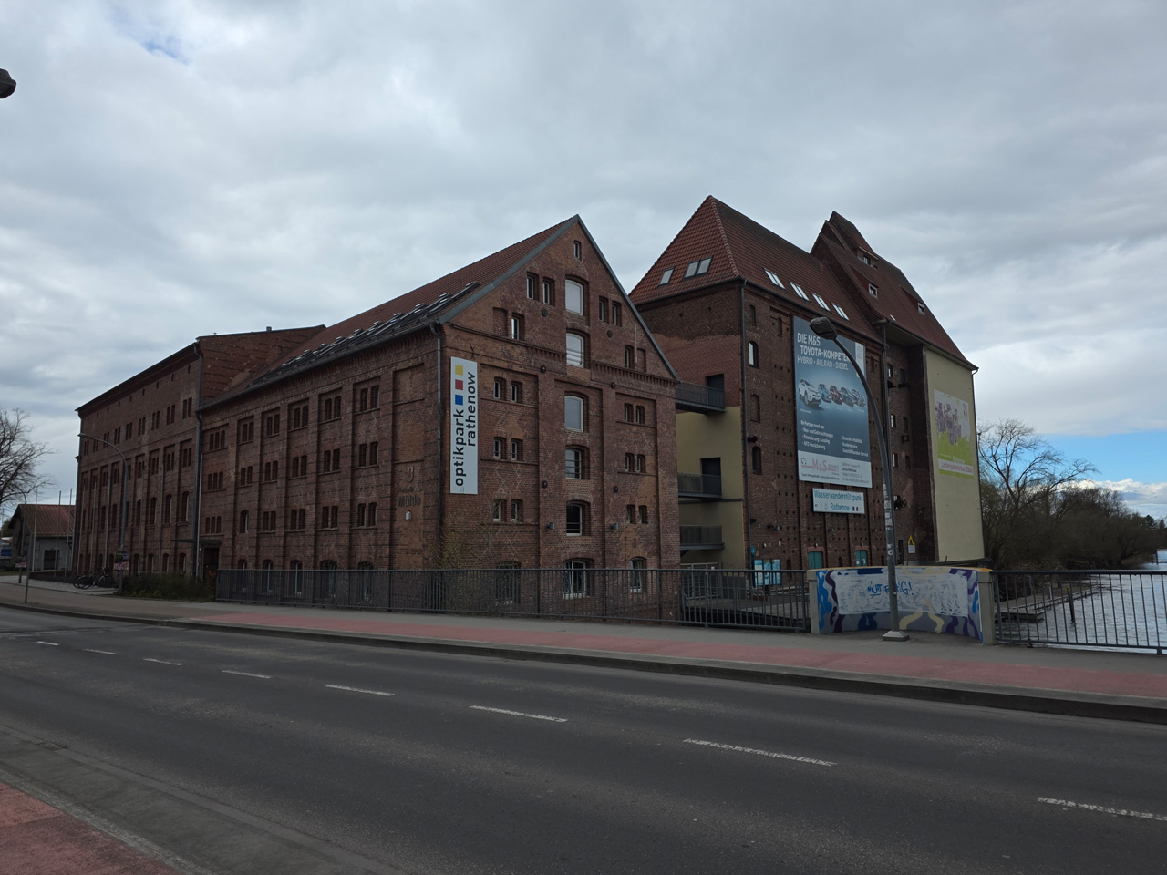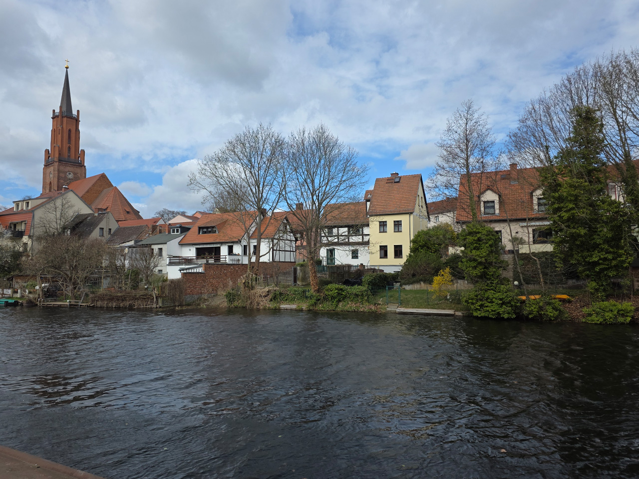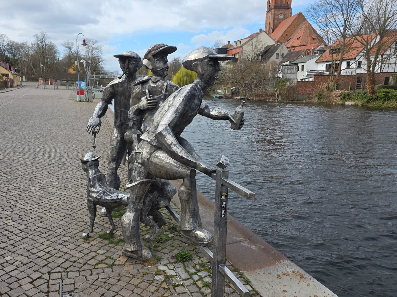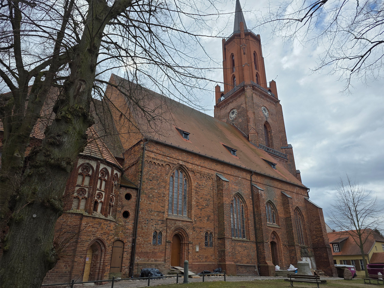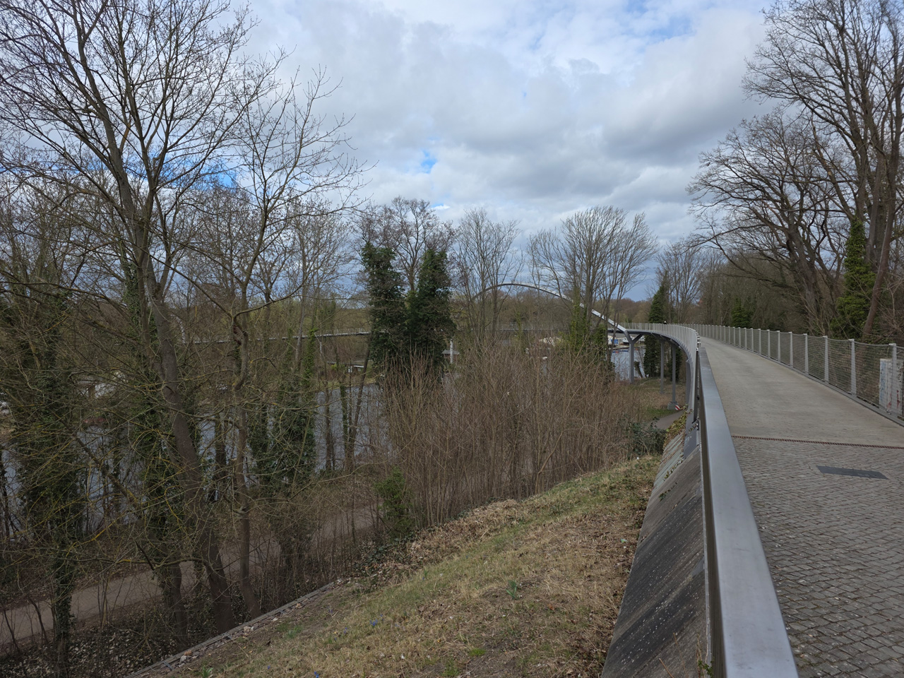Gegen Mittag sind wir aufgebrochen zu einem Spaziergang durch Rathenow. Wir sind entlang der Stadtschleuse auf den historischen Friedhof am Weinberg zugelaufen. Die Stadtschleuse ist fast trockengelegt. Man hat anscheinend im Winter den Grund der Schleusenkammer gereinigt. Der alte Hafen, heute sowieso nur noch Sportboothafen, ist verwaist. Wir sind auf den Friedhof gegangen und haben dabei das historische Torhaus passiert. Wir sind hoch zu der Auferstehungskirche gelaufen, die aber verschlossen war. Dabei haben wir den historischen Teil des Friedhofes durchlaufen. Hier gibt es überwiegend große Familiengrabstätten, von denen die meisten einen verwaisten Eindruck machen. Das Problem wird in den kommenden Jahrzehnten immer größer werden. Diese Grabkultur hat sich in den letzten Jahrzehnten drastisch geändert, weg vom großen, festen Grab mit Stein, hin zur Urnenbestattung mit kleiner Fläche oder sogar anonymer Bestattung. Der Friedhof macht dadurch einen verwahrlosten Eindruck. Aber wer soll sich auch noch die vielen Jahr nach dem Tod um das Grab kümmern. Vom Friedhof aus sind wir zu der futuristisch anmutenden Weinbergbrücke gelaufen, die anläßlich der Buga 2015 erbaut wurde. Auf ihr überquert man in luftiger Höhe die Rathenower Havel. Am Ende der Brücke sollte man eigentlich auf das Gelände vom Optipark kommen, dass befindet sich aber noch im Winterschlaf. Alle Zugänge sind verschlossen. Wir sind aber am Brachymedialfernrohr angekommen. Man kann es sich nur aus sicherem Abstand ansehen. Wir mussten die Sportflächen umrunden und kamen am Einkaufzentrum wieder heraus. Wir sind in das Kaufland gegangen und haben unsere Lebensmittelvorräte aufgefrischt. Auf dem Weg zum Womo haben wir noch eine Schleife durch die kleine Altstadt gemacht. Die St.-Marien-Andreas-Kirche war verschlossen. Eine große Tafel informierte uns über die Neugestaltung des Inneren der Kirche. Das Umfeld der Kirche hat noch einige Bauten aus dem Mittelalter. Wir sind wieder in unserem kuschelig warmen Womo angekommen.