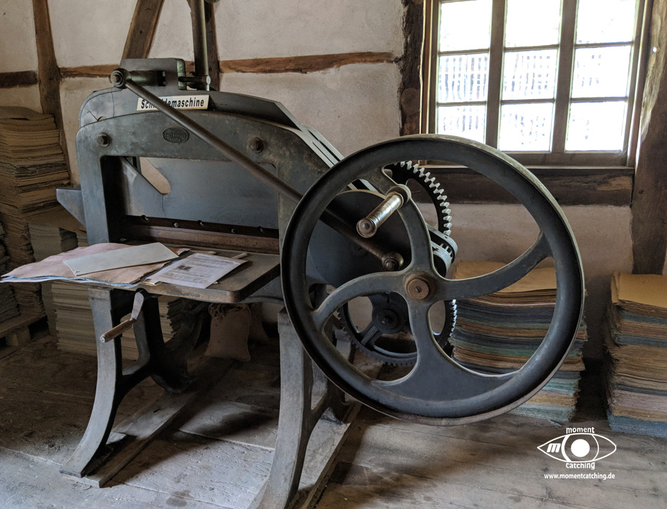 Aus der Zeit von etwa 1870 bis 1890 stammt die noch nahezu vollständig erhaltene maschinentechnische Ausstattung mit Rundsiebmaschine, Transmission, Sumpfbottich mit Rührwerk, Kollergang (Steinholländer), verschiedenen Spindelpressen, Glättmaschine und Papierschere.