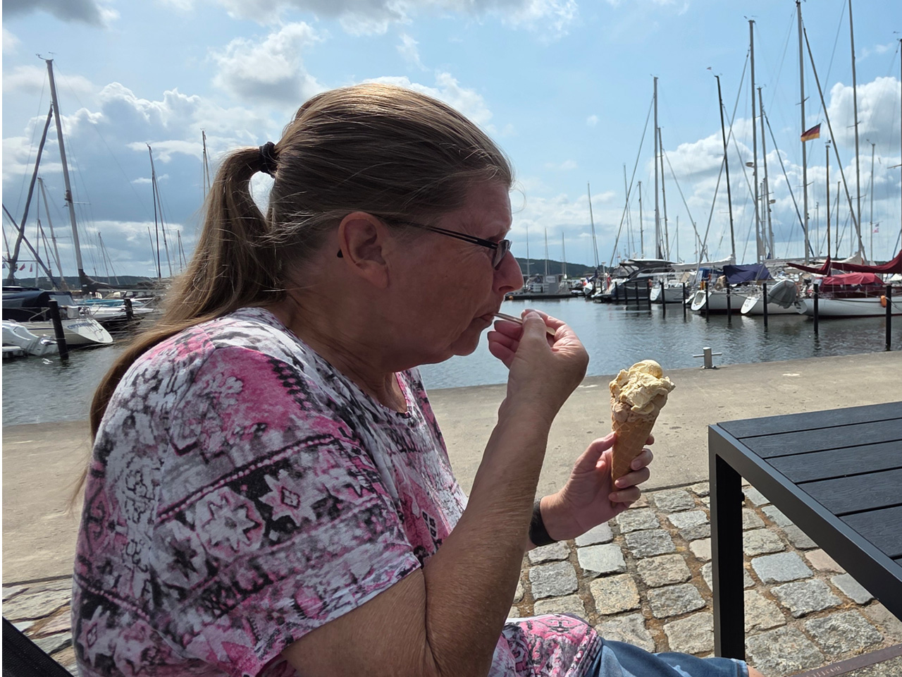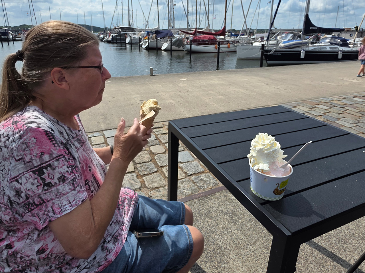 Nach einem Zwischenkaffee haben wir einen Spaziergang durch das Hafengebiet gemacht. Wir wussten, dass es dort eine Gaststätte mit leckerem Eis gibt. Da hier der Preis für eine Portion Eis wesentlich niedriger ist als in Dänemark, haben wir uns hier jeder eine Portion gegönnt. Das war wieder sehr lecker.
