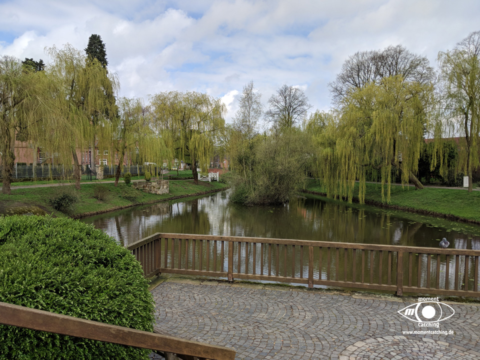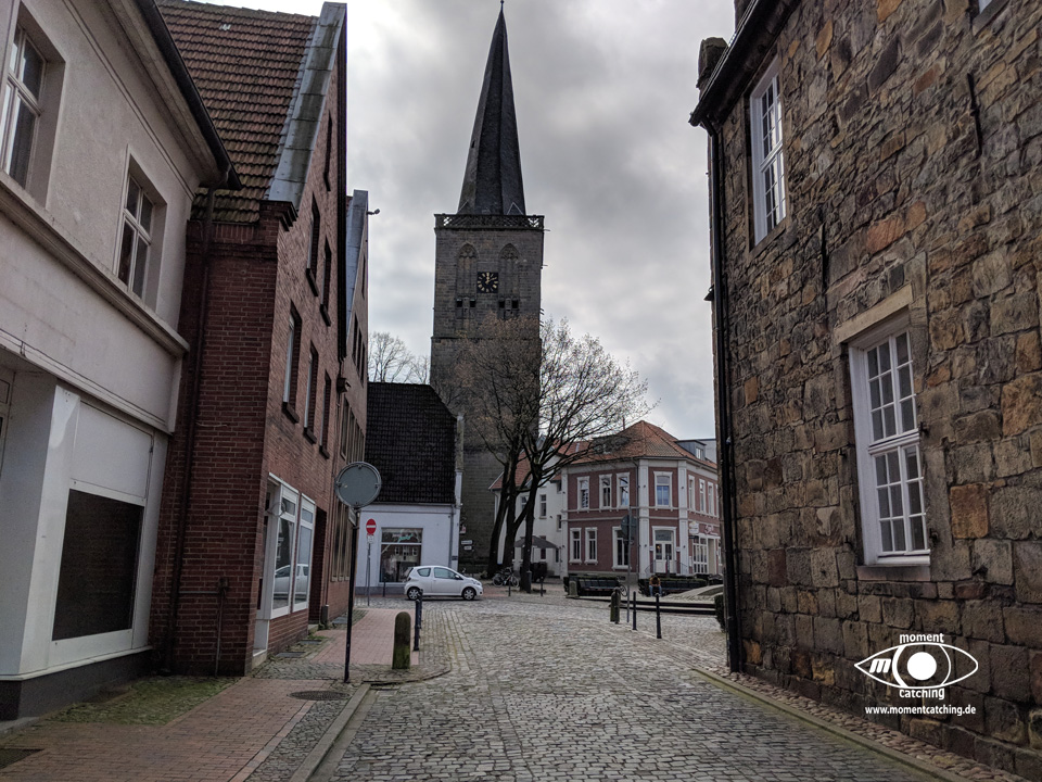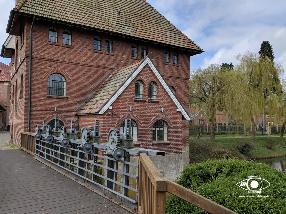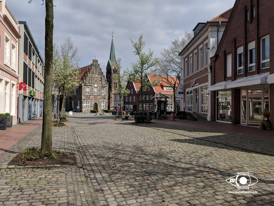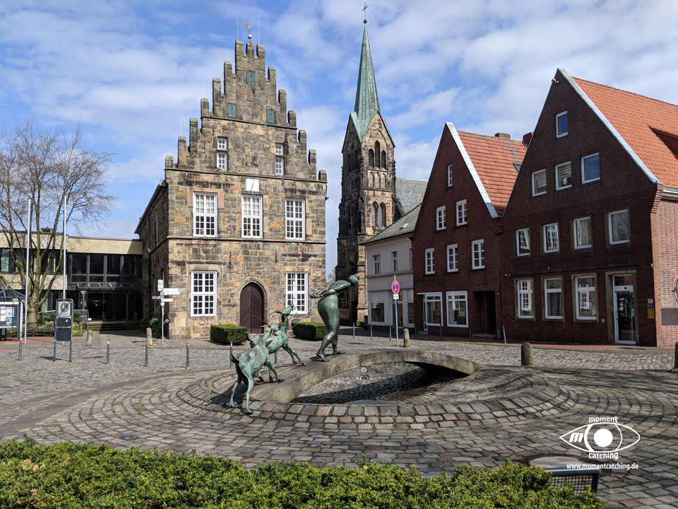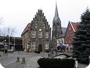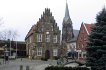 Das Rathaus, ein zweigeschossiger Quaderbau aus Bentheimer Sandstein mit Staffelgiebel aus dem 15. Jahrhundert, in das die Schüttorfer Elle
