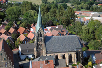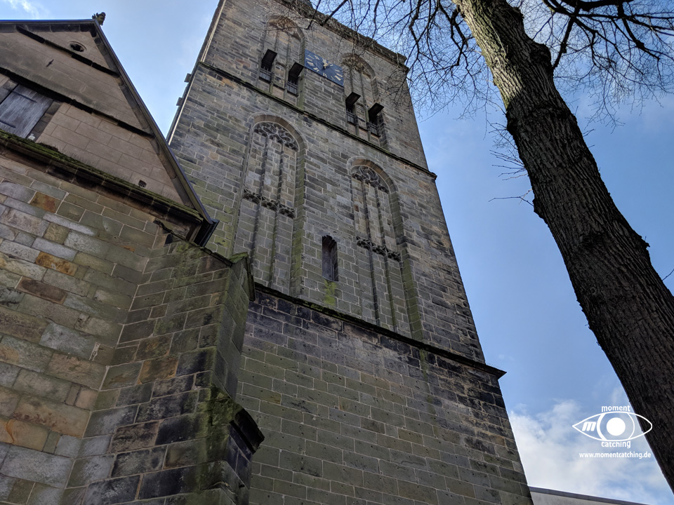 Die Kirche ist insgesamt 54 m lang und 19 m breit. Der Turm ist 81,17 m hoch und von ganz Schüttorf aus zu sehen. Diese Kirche wurde erstmals 1355 urkundlich erwähnt, als ein Ablassbrief zum Bau der Kirche verkauft wurde, und 1390 erweitert. Mit dem Bau des Chores des heutigen Gebäudes wurde am Dienstag nach Fronleichnam des Jahres 1477 angefangen, fertiggestellt war er am Abend des 24. Dezember 1478. Mit dem Bau des Kirchenschiffs wurde 1500 begonnen, der quadratische Westturm wurde bis 1535 erbaut und verfügt über einen achtseitigen Pyramidenhelm. Er brannte aber sechsmal (1684, 1703, 1799, 1817 (zweimal innerhalb von zwei Tagen) und 1889) infolge von Blitzschlag ab. Eine Legende besagt, dass der letzte Brand des Turmes am 8. Februar 1889 mit Milch gelöscht wurde, die sich in der Hitze des Feuers verkrustete und die Feuersbrunst erstickte. Die ursprünglichen Glocken für den Turm stammen aus den Jahren 1502 und 1772, im Jahr 1917 mussten diese Glocken aber zum Einschmelzen für die Kriegsproduktion abgeliefert werden. Heute hängen sechs Glocken im Turm, darunter eine alte Brandglocke aus dem Jahr 1435, die 1917 verschont wurde. Die Orgel der großen Kirche ist ein zweimanualiges Instrument mit Zinn-Pfeifen. Sie wurde 1963 von dem Schweizer Orgelbaubetrieb Th. Kuhn gebaut.