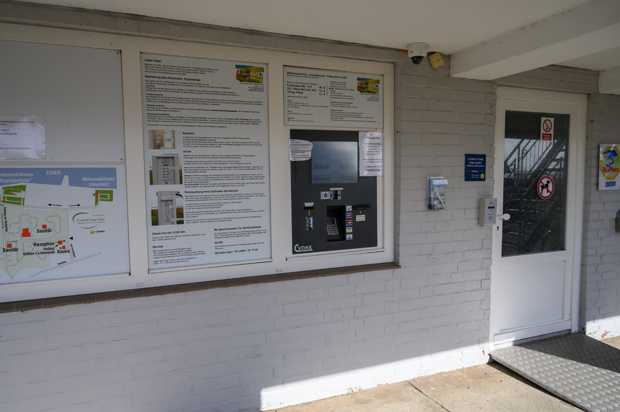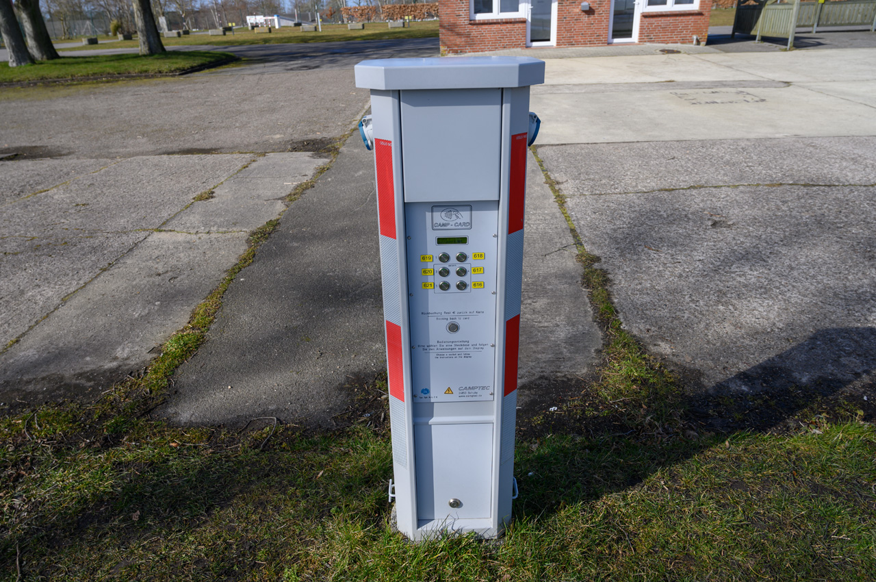 • Die Benutzung der Stromsäulen und der Duschen sowie der Trinkwassersäule erfolgt mittels Magnetkarte, die man über den Automaten nach dem Bezahlvorgang erhält.