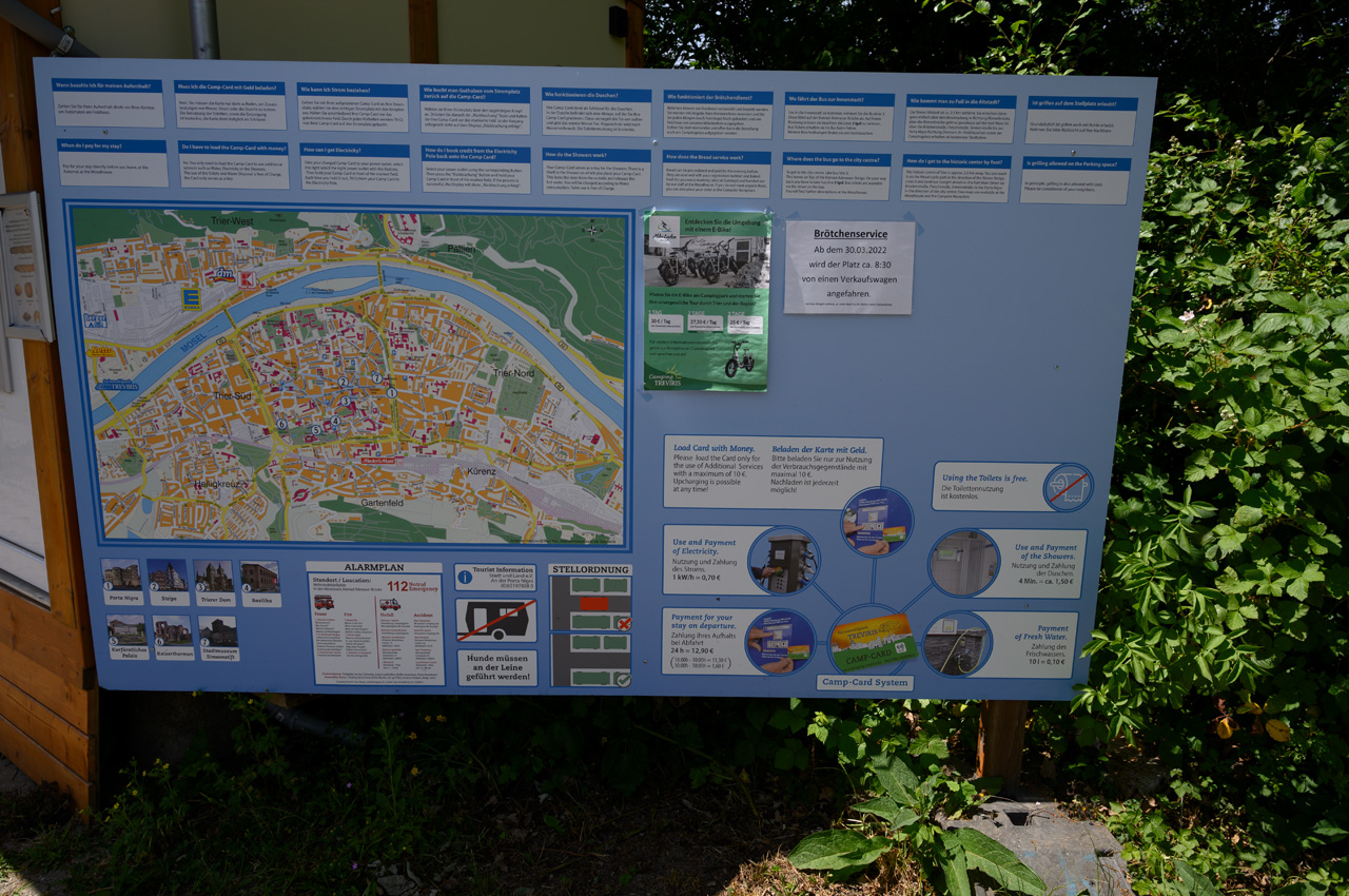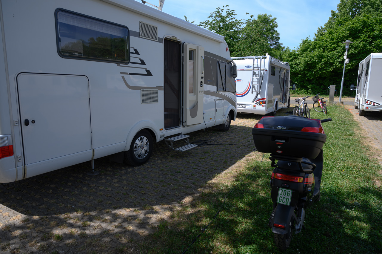 Der Platz ist nicht so ganz einfach zu finden. Er hat mehrere Zufahrtsmöglichkeiten. Wenn man erstmal bescheid weis, ist es ganz einfach. Der Platz ist für unsere Bedürfnisse sehr gut ausgestattet. Die Stellflächen bieten ausreichend Platz auch für die Campingmöbel. Um den NIU entladen zu können, müssen wir die Mittelfelder nutzen, dort geht es problemlos. Der Brötchenservive ist wählbar, ob Bäckerwagen mit direktem Kauf oder Abholung nach Bestellung am Vortag in der Rezeption des Campingplatzes muss man selbst entscheiden.