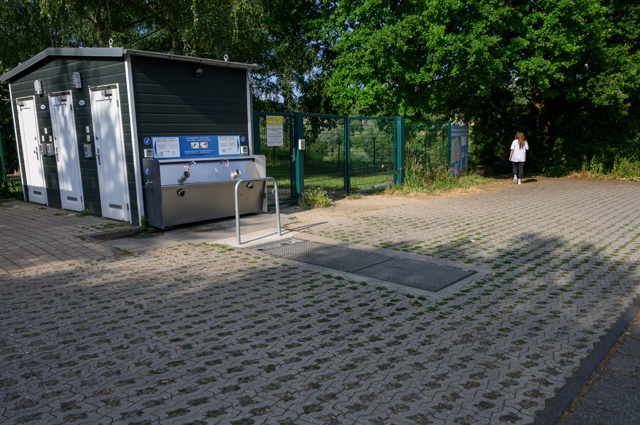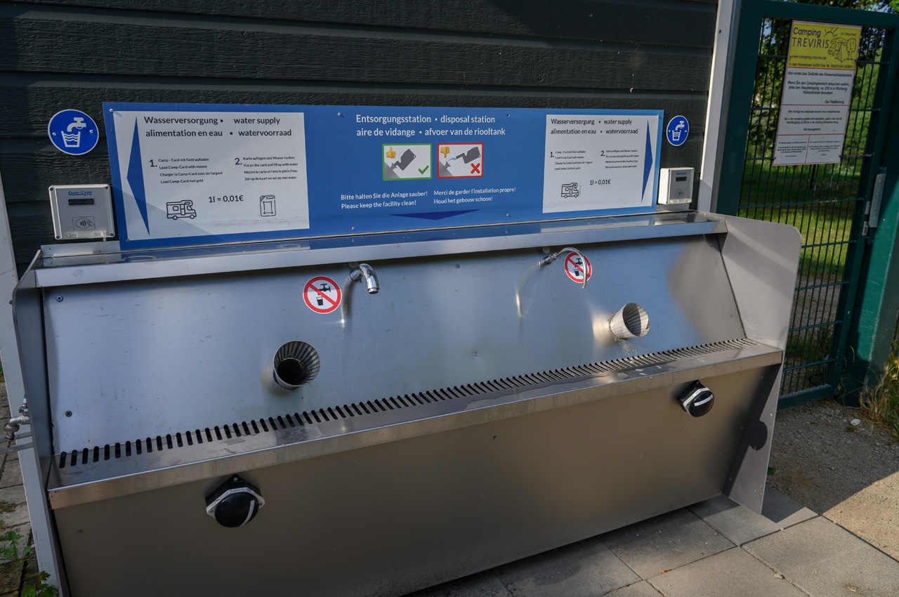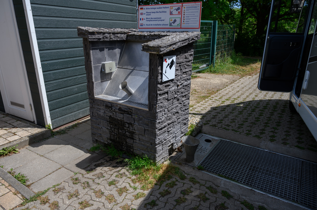 - Die V+E ist modern und funktionell. Sie wurde 2022/23 nochmals optimiert. Es gibt jetzt zwei Einlässe für Fäkalien. Der Bodeneinlass für Grauwasser ist groß und muss nicht punktgenau angefahren werden. Frischwasser erhält man über die Zugangskarte, sofern man ein Guthaben aufgebucht hat.