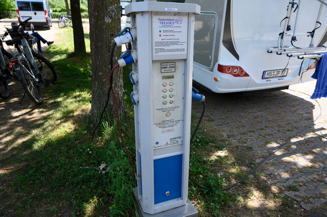 - Die Stromanschlüsse sind in CEE-Ausführung mit 16A abgesichert an entsprechend verteilten Säulen. Bezahlt wird über das Kartensystem. Nicht alle Plätze sind mit Strom ausgestattet. Die Seitenstreifen müssten das Kabel über die Fahrbahn legen.