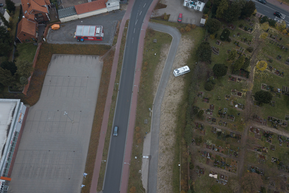 - Die Satellitenschüssel geht in Richtung Friedhof. Vor dem Ausfahrbereich gibt es an der Friedhofsmauer bei den hohen Büschen Empfangsprobleme.