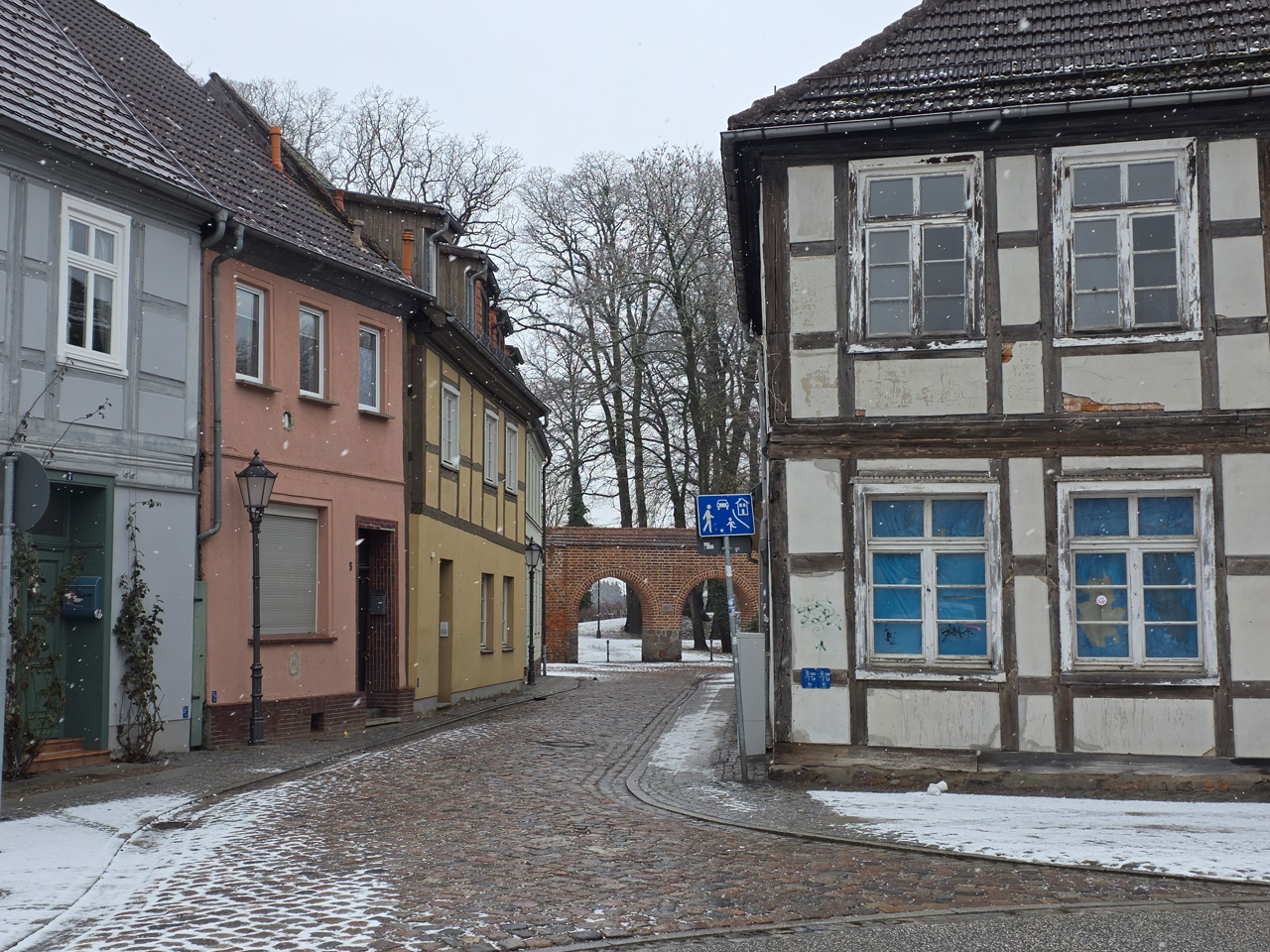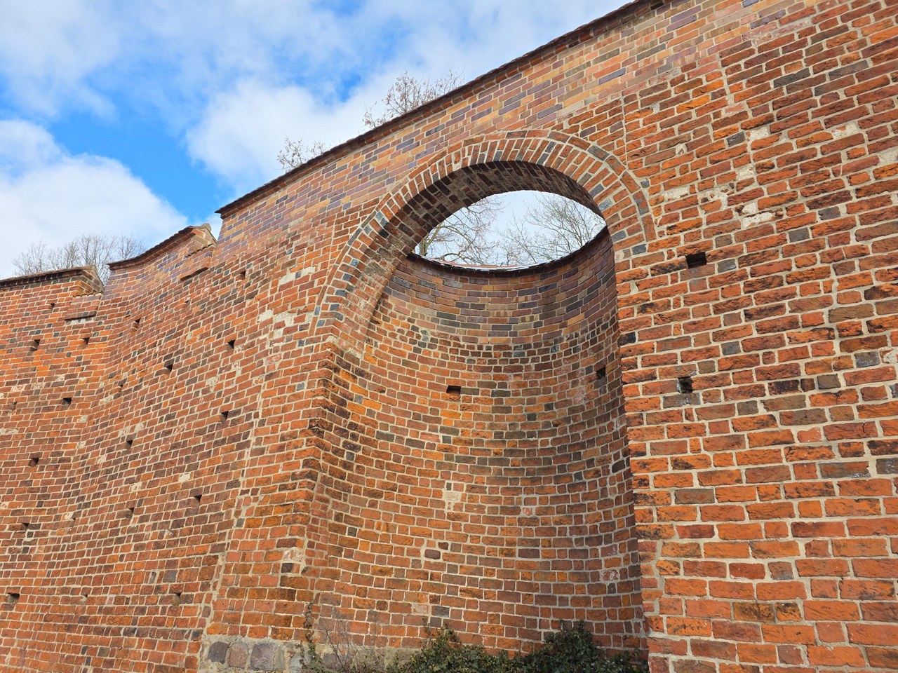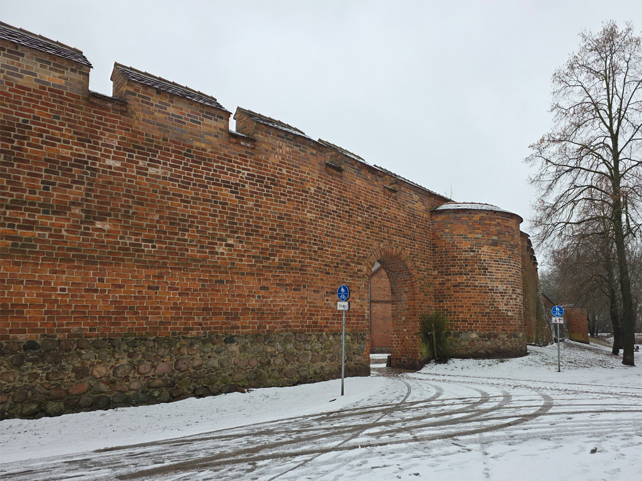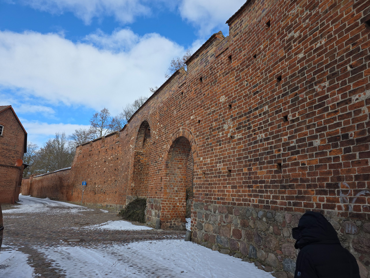 Gegen 11:30 Uhr haben wir uns wieder auf den Weg in die Altstadt gemacht. Wir hatten jetzt um die 0°C und der Schnee war sehr matschig. Unser erstes Ziel war Roßmann am Markt. Susanne wollte sich dort Tape Band kaufen, weil ihr Rücken seit einigen Tagen wieder schmerzt. Nach erfolgreichem Einkauf sind wir zur Bischofsburg gelaufen. Trotz des Schneefalls von gestern, waren die Gehwege weitestgehend beräumt. In dem Turm der ehemaligen Bischofsburg befindet sich ein Museum über den 30-jährigen Krieg und in einem angrenzenden Gebäude ist eine Kunstausstellung. Die dort ausgestellten Exponate wurden von Schülern von der 7. bis zur 13. Klasse erstellt. Klassische Gemälde haben ein Gesicht bekommen, was an die Donald Duck Figuren angelehnt ist. Verrückte Idee. Da das Museum im Turm über 7 Etagen verteilt ist und es keinen Aufzug gibt, habe ich mir das Museum allein angesehen und Susanne hat sich mit einem Audioguide in den Vorraum zur Kunstausstellung gesetzt. Das Museum hat mich nicht begeistert. Die angebotenen Informationen hätte man in ein kleines Handbüchlein zusammenfassen können und in gedruckter Form vermarkten können. Das Museum kann man sich sparen, da es kaum Exponate hat. Die Kunstausstellung haben wir uns dann zusammen angesehen. Die war witzig. Waren doch großartige Ideen dabei, die klassischen Gemälde mit einem Entengesicht darzustellen. Nach dem Museumsbesuch sind wir an der Ostflanke der Stadtmauer entlang, zum Womo zurückgegangen. Auf diesem Weg hat man diverse schöne Blicke auf die wuchtige Stadtmauer und ihre einstigen Türme.