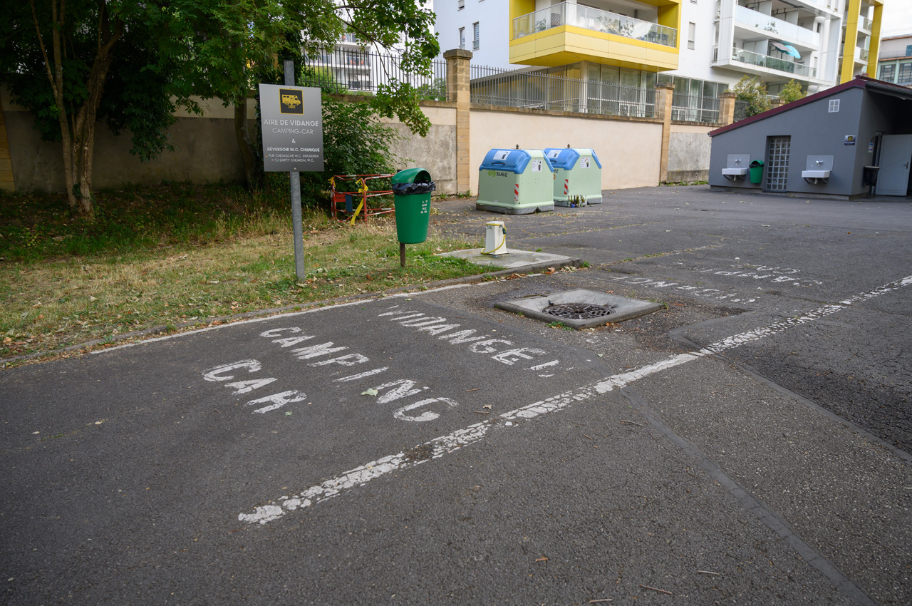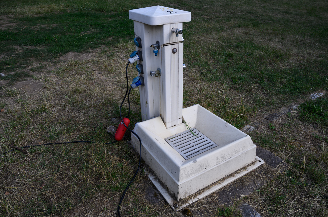 - Es gibt eine zentrale V+E mit einem großen Bodeneinlass. Trinkwasser gibt es aber auch an jeder Stromsäule. An den Sanitärgebäuden gibt es auch noch jeweils eine Station zum Entleeren der Fäkalienkassetten.