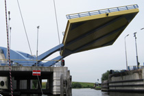 von 15 × 15 × 0,5 Meter dreht sich beim Öffnen mit 45° weg. Da Haupt- und Querträger fehlen und die Konstruktionsdicke niedrig ist, kann die Brücke imposant in die Höhe bewegt und eine optimale Durchfahrtshöhe erreicht werden. Das Gegengewicht der Konstruktion ist neben der Straße gebaut, so dass sich beim Absenken zugleich eine weitere Besonderheit auftut, denn dann „verschmilzt“ die Brücke wieder mit der Straße.