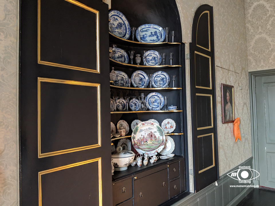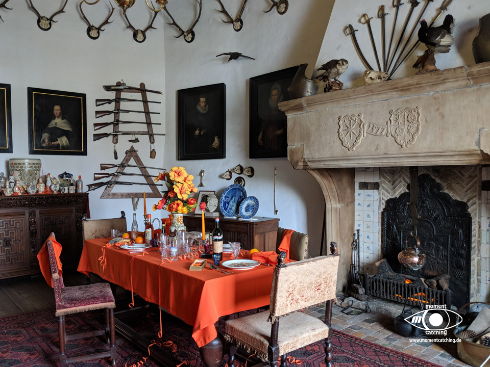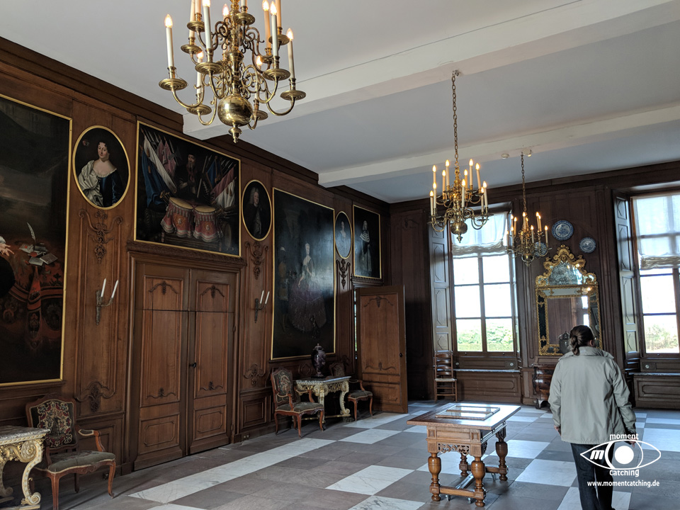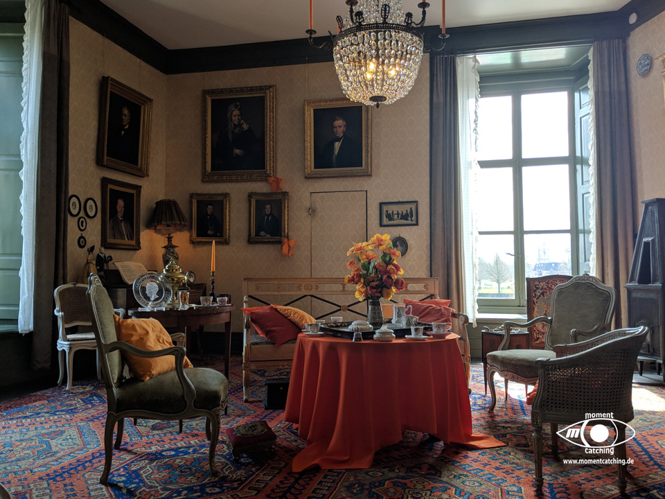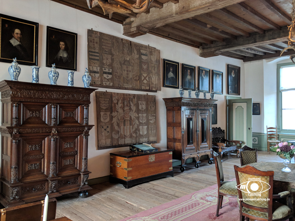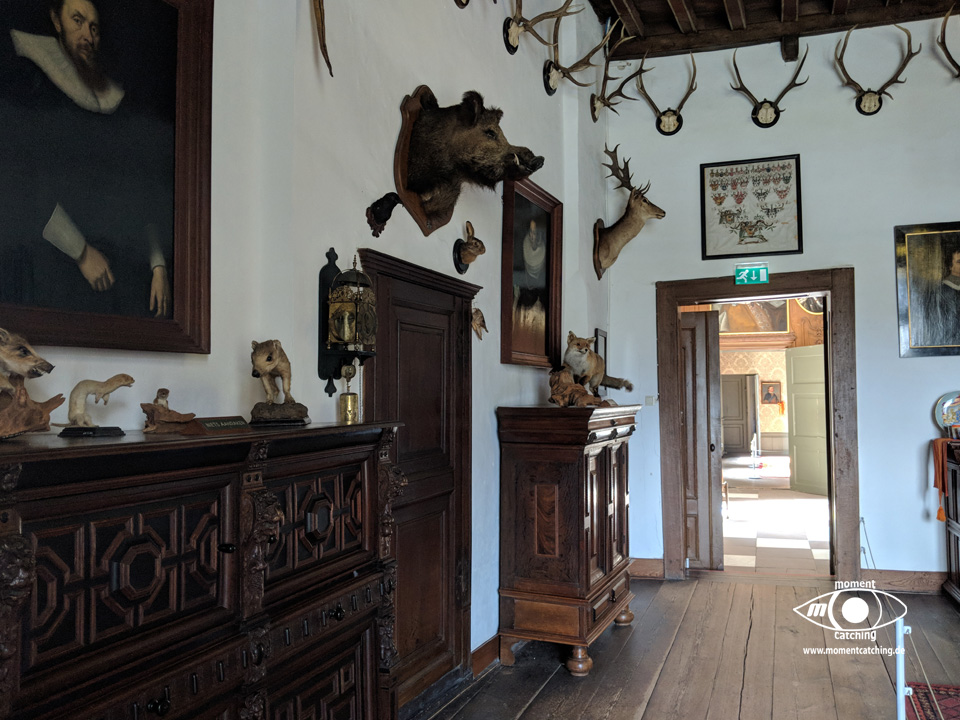 Hinter dem Eingang im Erdgeschoss befindet sich eine langgestreckte, schmale Terrasse, an die sich eine dahinter liegende große Halle anschließt. Auf der rechten Seite befinden sich repräsentative Räume, ein Jagdzimmer (wegen der hellen Wände auch die weiße Kammer genannt) mit anschließendem Salon, in dem sich auch Bilder der Vorbesitzer befinden, sowie die mit vielen Ölgemälden versehene Huysumkammer, die nach dem Maler des 17. Jahrhunderts Justus van Huysum benannt wurde. Auf der linken Seite der großen Halle schließen sich ein Schlafzimmer sowie ein Speisezimmer an, das über eine steile Wendeltreppe mit der direkt darunter liegenden Küche verbunden ist. Das blaue Porzellan-Service im Speisezimmer stammt noch von der Familie van Isendoorn. Einige Räume sind mit Kaminen ausgestattet, deren Umrahmung aus Delfter Fliesen bestehen. Im nordöstlich gelegenen Wehrturm befindet sich ein Boudoir.