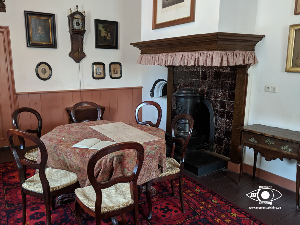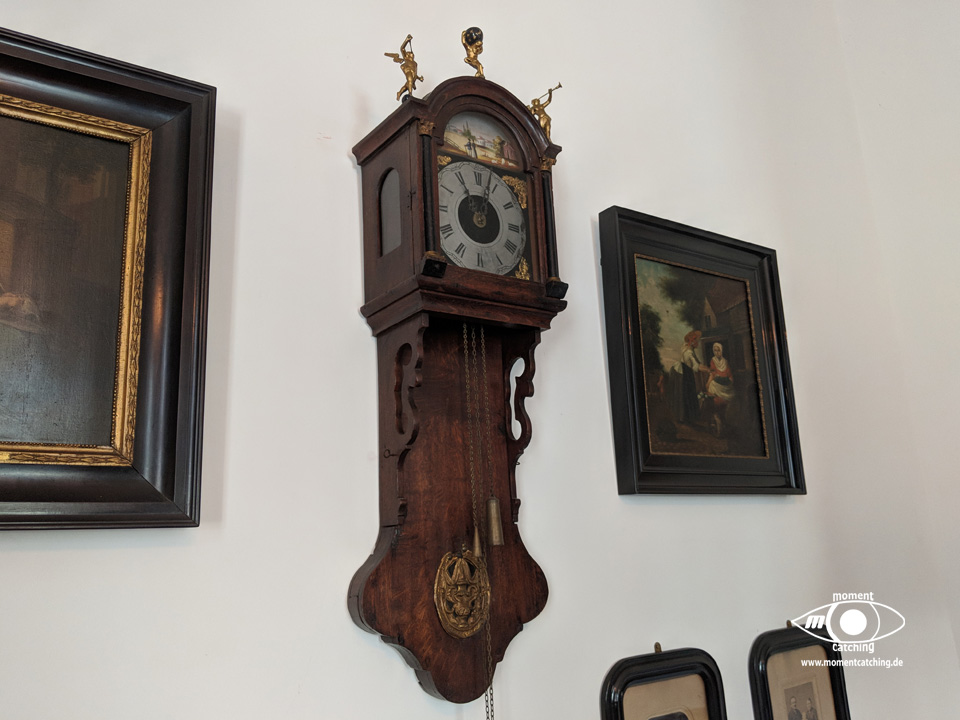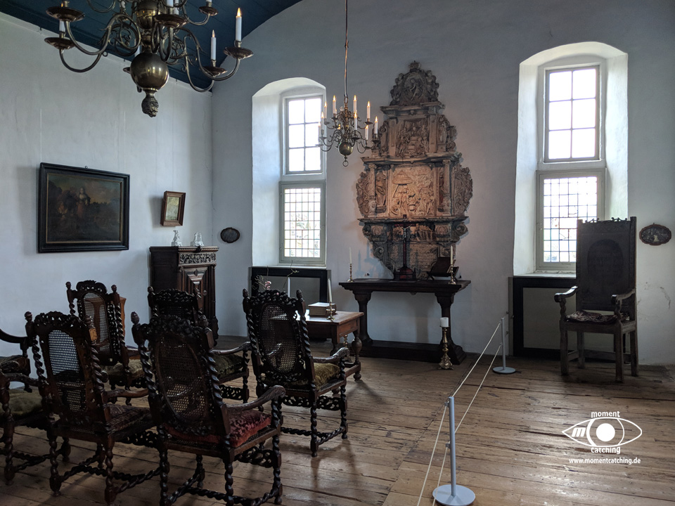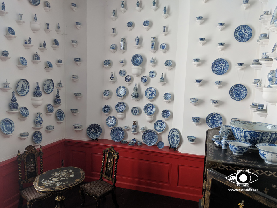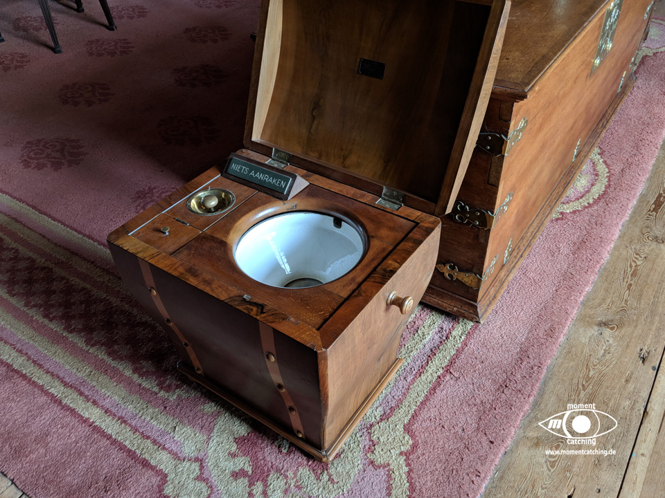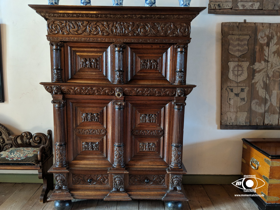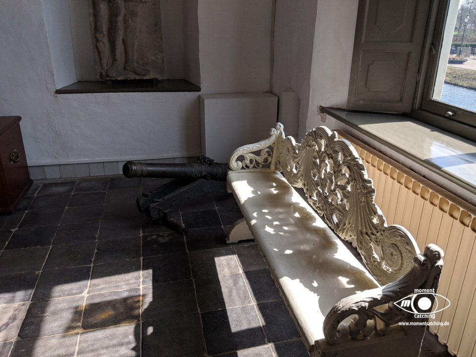 Hinter dem Eingang im Erdgeschoss befindet sich eine langgestreckte, schmale Terrasse, an die sich eine dahinter liegende große Halle anschließt. Auf der rechten Seite befinden sich repräsentative Räume, ein Jagdzimmer (wegen der hellen Wände auch die weiße Kammer genannt) mit anschließendem Salon, in dem sich auch Bilder der Vorbesitzer befinden, sowie die mit vielen Ölgemälden versehene Huysumkammer, die nach dem Maler des 17. Jahrhunderts Justus van Huysum benannt wurde. Auf der linken Seite der großen Halle schließen sich ein Schlafzimmer sowie ein Speisezimmer an, das über eine steile Wendeltreppe mit der direkt darunter liegenden Küche verbunden ist. Das blaue Porzellan-Service im Speisezimmer stammt noch von der Familie van Isendoorn. Einige Räume sind mit Kaminen ausgestattet, deren Umrahmung aus Delfter Fliesen bestehen. Im nordöstlich gelegenen Wehrturm befindet sich ein Boudoir.