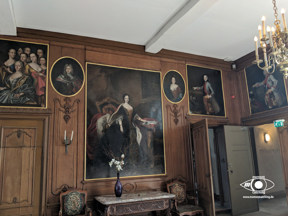 Über eine steinerne Wendeltreppe gelangt man in die erste Etage. Die dortige große Halle ist mit Ölgemälden bedeutender Familien aus dem Gelderland bestückt. An der östlichen Seitenwand ist ein Stammbaum mit den Vorfahren von Elbert van Isendoorn à Blois und seiner ersten Frau Maria Hadewig van Essen angebracht. Die Decke ist vertäfelt und mit Holzbohlen verkleidet. Von der Halle gelangt man in einen als Bibliothek oder Arbeitszimmer eingerichteten Raum, der wegen seiner roten Tapete auch als Rode Kamer (Rotes Zimmer) bezeichnet wird. In der ersten Etage befindet sich auch eine kleine Kapelle. Das dort in die Westwand eingelassene Sandsteinepitaph stammt ursprünglich aus einer römisch-katholischen Kirche des 16. Jahrhunderts im Herzogtum Oldenburg, wurde von Richard Cleve angekauft und nach 1900 in die Westwand der Kapelle eingefügt.