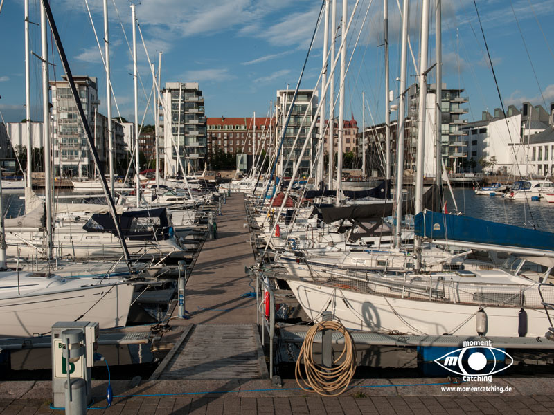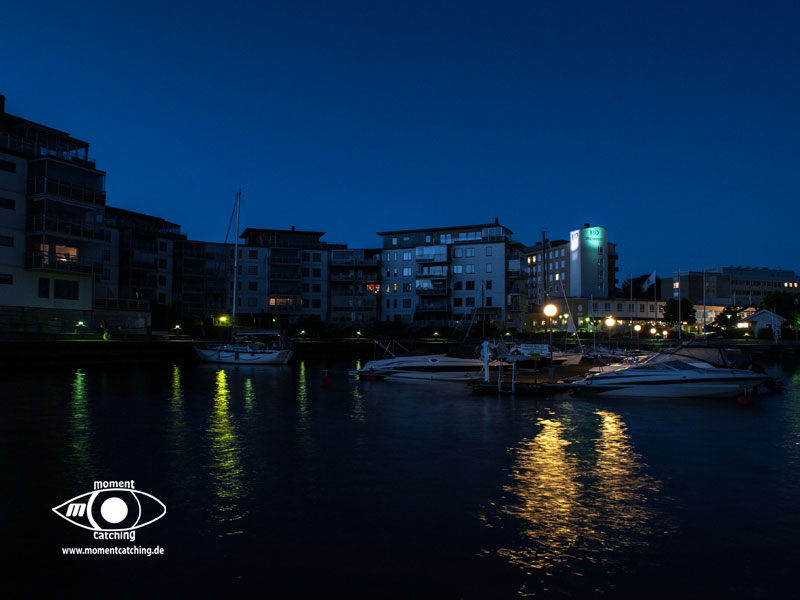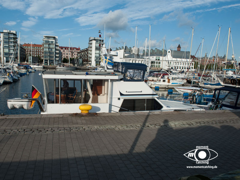 In Malmö lagen wir im Yachthafen Lagunen, was auch unser erster Hafen in Schweden war. Die bemerkenswert freundliche und hilfsbereite Hafenmeisterin hinterliess einen bleibenden Eindruck bei uns. Da wussten wir noch nicht, dass wir in fast allen Häfen in Schweden auf so nettes und hilfsbereites Personal stoßen würden. Der Hafen liegt etwas außerhalb des Stadtzentrums. Zu Fuß braucht man etwa eine gute halbe Stunde, mit dem Fahrrad keine 10 Minuten. Obwohl der Hafen sehr groß ist, liegt man hier sehr ruhig und weit ab von ständigen Spaziergängern. Der Hafen hat eine Bunkerstelle und einen kleinen Imbiß, der für schwedische Verhältnisse recht preiswert ist. Die Stadt hat eine Menge an Sehenswürdigkeiten zu bieten und es lohnt sich ein längerer Aufenthalt. Außerdem ist sie ein günstiger Ausgangspunkt für einen Besuch in Kopenhagen. Mit der Eisenbahn fährt man vom Hauptbahnhof Malmö bis zum Hauptbahnhof Kopenhagen ganze 35 Minuten. Der Zug fährt über die Öresundbrücke mit herrlicher Aussicht über den Öresund in luftiger Höhe. Malmös Wahrzeichen, der Turning Torso, ist mit seinen 190 Metern Höhe ein weit sichtbares Bauwerk. Er ist das Zentrum in einem Neubauviertel im Västra Hamn. Uns beeindruckte die moderne Architektur, die sich an der Uferpromenade konsequent in jedem Detail durchzieht. Es macht einfach Spaß, hier zu promenieren und die verschiedenen Ausblicke auf den Öresund zu genießen. Im Zentrum der Altstadt, auf schwedisch Gamla Staden, tobt das touristische Leben. Uns fiel auf, wie liebevoll gepflegt und mit Blumen dekoriert hier die ehrwürdigen historischen Gebäude sind. Wer einkehren will hat die Qual der Wahl. Es gibt viele Gaststätten mit Außenplätzen, wo man die vorbeiziehenden Menschen auf sich wirken lassen und das schöne Wetter genießen kann. Etwas enttäuscht waren wir von dem Schloss Malmöhus. Es wird in den Unterlagen als größtes Renaissanceschloss Skandinaviens angepriesen. Das nit der Größe mag wohl stimmen, aber bis auf den Eingangsturm hat es so gar nichts mit unserem Klischee von einem Schloss zu tun. Dafür ist der dahinterliegende Schlosspark mit Windmühle und wunderschönen Blumenrabatten um so schöner. Ein absolutes Muss an Sehenswürdigkeiten in Malmö ist der Pildammsparken. Hier haben uns besonders die beschnittenen Baumalleen beeindruckt. Ein besonders schöner Bereich ist die Blomstergatan an deren einem Ende der sogenannte Margaretapaviljongen steht. | 21. Mai 2013 | |