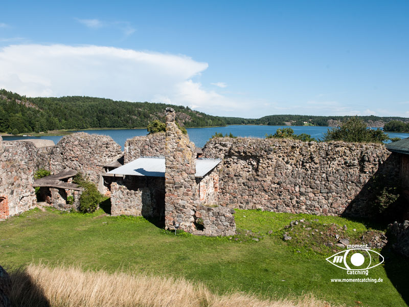 Stegeborg ist ein kleiner Ort an der engsten Stelle des Slätbaken. Die Häuser von Stegeborg liegen weit verstreut in der Landschaft. Es gibt ein Schloss mit einem Gutshof, das noch in Privatbesitz ist. Direkt in der Nähe steht das Hotel Stegeborg und ist auch der Flugplatz für Kleinflugzeuge. Die Landschaft entlang des südlichen Ufers vom Slätbaken ist eher flach und bestens geeignet für Fahrradtouren. Der Yachthafen unmittelbar bei der Schloßruine ist sehr gut, besonders die sanitären Einrichtungen. Auch die Gaststätte, bei der man die Liegegebühren entrichtet, können wir empfehlen. Das Preisleistungsverhältnis stimmt und die Bedienung ist sehr freundlich und aufmerksam. Eine Besichtigung der Burgruine lohnt sich. Man erhält ebenfalls in der Gaststätte einen Audioguide, der auch in deutsch durch die Ruine führt und interessante Informationen gibt. Wir hatten uns schon beim Eingang in die Ruine über den starken Geruch nach Lakritze gewundert. Der Audioguide informierte über den spanischen Kerbel, der außerhalb der Burg seit mehreren Jahrhunderten wächst. Wenn man seiner Nase folgt, findet man auch die Pflanzen. | 14. August 2013 | |
