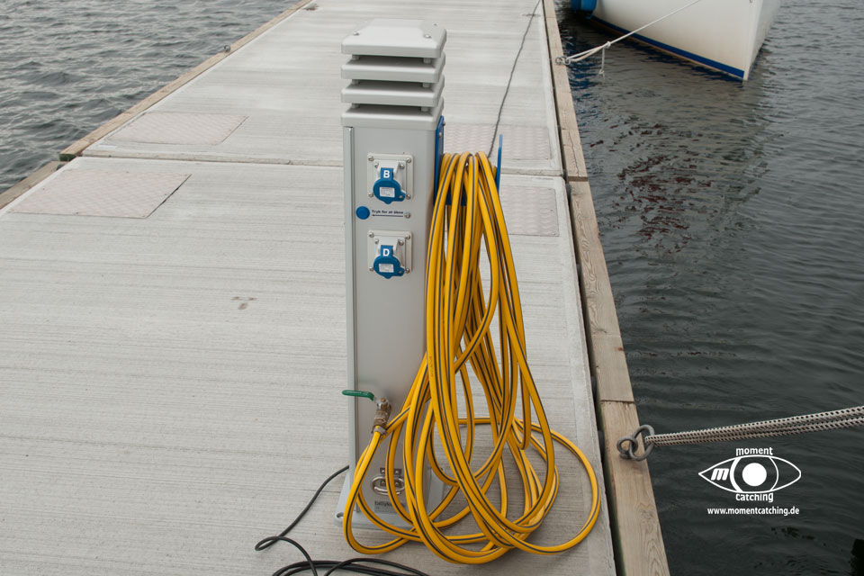 Der Wind pfeift noch ganz schön, aber am Morgen war es schlimmer. Wir fahren jetzt doch, da wir nur den Guldborgsund vor uns haben. Wir haben trotzdem alles vertäut. Sicher ist sicher. An der Brücke ist eine große digitale Anzeige der nächsten Öffnungszeit. Leider erst 13:50 Uhr. Leider kann ich in meinen Unterlagen nichts über die Signalgebung der Brücke finden. Jetzt brennt ein rotes Licht. Wegen der bevorstehenden Wartezeit haben wir beschlossen zu ankern. Leider endete unser Ankermanöver mitten im Fahrwasser, durch den Westwind. Egal, es kann ja sowieso keiner durchfahren. Die Brücke läßt drei rote Lichter übereinander blinken. Jetzt wissen wir, das bedeutet, vorbereiten für die Durchfahrt. Zwei rote Lichter übereinander bedeuten, der Gegenverkehr darf fahren. Drei rote Lichter übereinander bedeutet, man darf die Brücke durchfahren. Die Erklärung habe ich leider erst im Hafen gefunden, bei der Guldborgsundbrücke. Ein netter Däne der uns entgegen kam hat uns zugerufen, dass wir fahren dürfen. Der sogenannte Lystbodehafen gehört mehreren Clubs bzw. Vereinen. Wir wollten uns erst außen längsseits hinlegen. Das ist aber absolut blöd, weil man über das Holzgeländer steigen muss. Also haben wir nochmals umgesetzt und uns innen am Platz 283 hingelegt. Dieser Bereich gehört zu Käre Gästesejler.