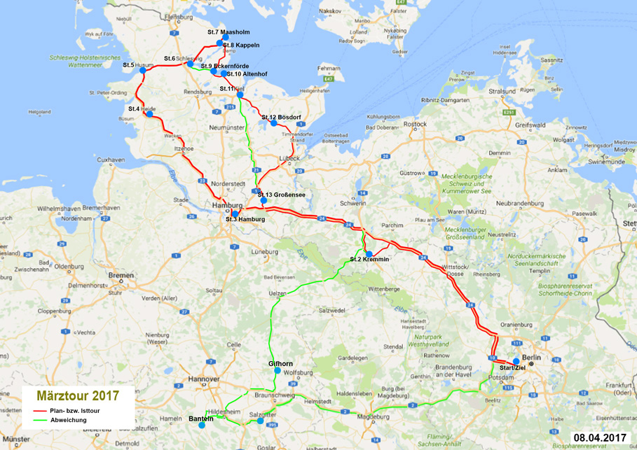 - Diese Tour war eigentlich als reine Schleswig-Holstein-Tour geplant. Aber wie so oft, kam es dieses mal ganz anders. Ingrid, die Frau meines Bruders, ist für uns sehr überraschend gestorben. Sie war die Treppe in ihrem Wohnhaus heruntergefallen und hat sich einen Oberschenkelhalsbruch zugezogen und lag damit im Krankenhaus. Dort ist sie dann aber an einem Herzinfarkt im Krankenhaus gestorben. Da die Beerdigung sehr kurzfristig angesetzt wurde, konnten wir die Tour so abändern, dass wir am Ende der Tour bei Bernd in Banteln eintreffen und an der Beerdigung teilnehmen können.