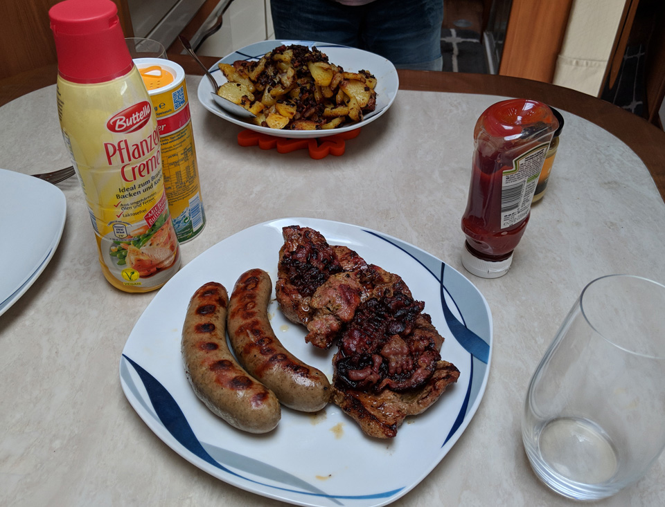 Wir sind mit dem auf dem Stellplatz am Winterhafen in Magdeburg eingetroffen. Der Stellplatz ist etwas improvisiert, aber für Magdeburg alternativlos. Wir stehen auf dem Platz Nr. 18, das ist der zweite vor dem Yachthafengelände. Heute haben wir gegrillt und dazu Bratkartoffeln gemacht. Dafür haben wir das erste mal die Induktionsplatte benutzt und die neue emaillierte Bratpfanne. Ich habe dummerweise zuerst den Speck und die Zwiebeln in die Pfanne gemacht. Dadurch sind sowohl Speck als auch Zwiebeln ziemlich verbrannt. Da muss ich wohl noch etwas üben. |