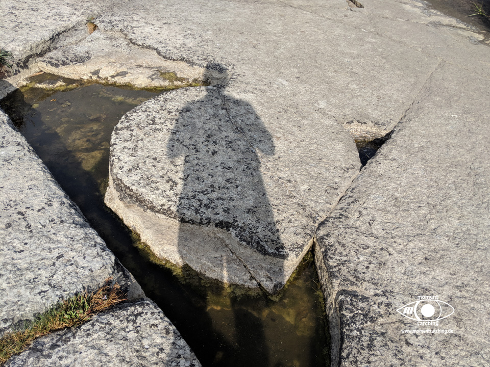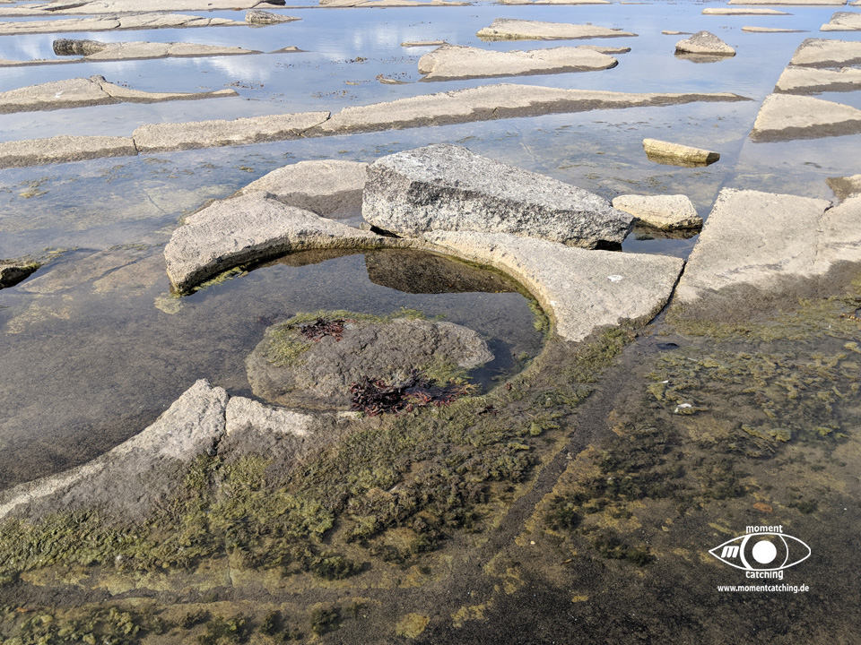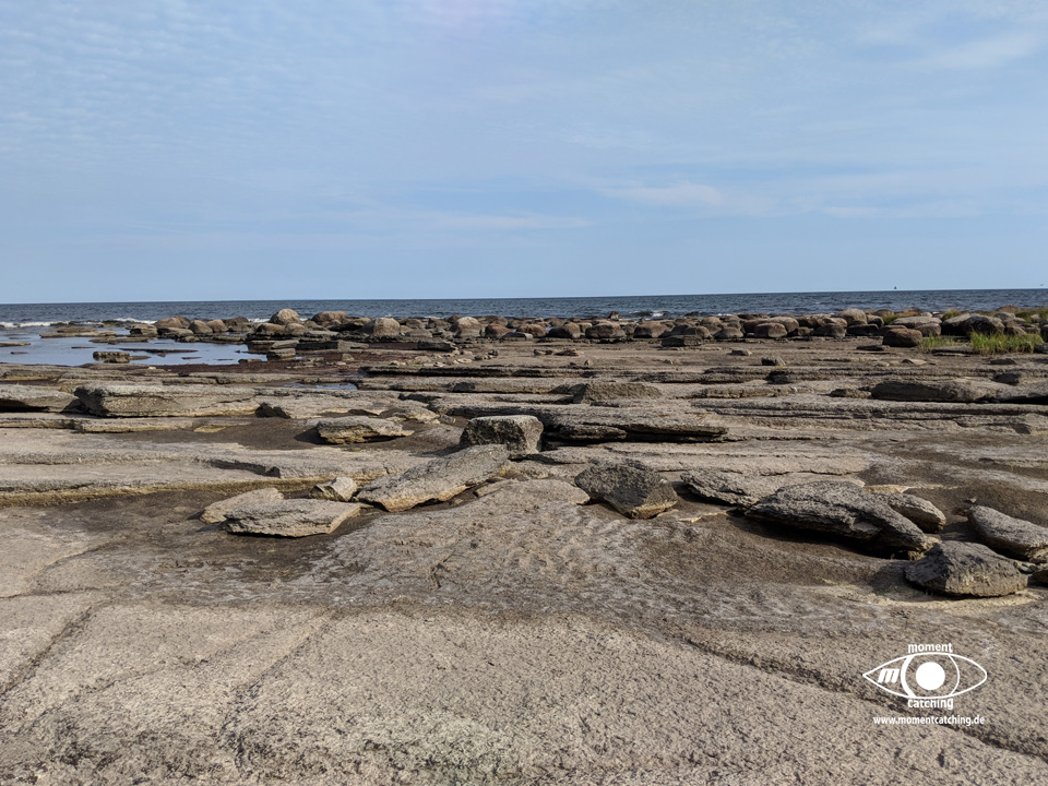 Wir haben den Stellplatz Gislövshammar, Hammarlunda bei Simrishamn erreicht. Von dem Platz hat man einen schönen Blick auf die Ostsee und sieht die Umrisse vom Westufer von Bornholm. Der Platz ist sehr minimalistisch ausgestattet aber hat Strom und Wasser und man kann die Toilettenkassette leeren. Wir stehen ganz oben am Feld und genießen den Ausblick. Das Gelände ist sehr schief und wir stehen mal wieder auf Keilen. Wir haben vom Stellplatz Hammarlunda bei Simrishamn aus einen Spaziergang zur Küste gemacht. Der kleine Fischerort Gislövshammar birgt einige geschichtliche Besonderheite. Neben den umliegenden Steinzeitgrabstätten war hier ein Steinbruch für Mühlsteine. Das Dorf ist wirklich extrem klein, aber sehr idyllisch. Der ehemalige Steinbruch ist direkt am Wasser. Die vielen kreisrunden Löcher ergeben ein skurriles Bild. Teilweise steht Brackwasser darin. |