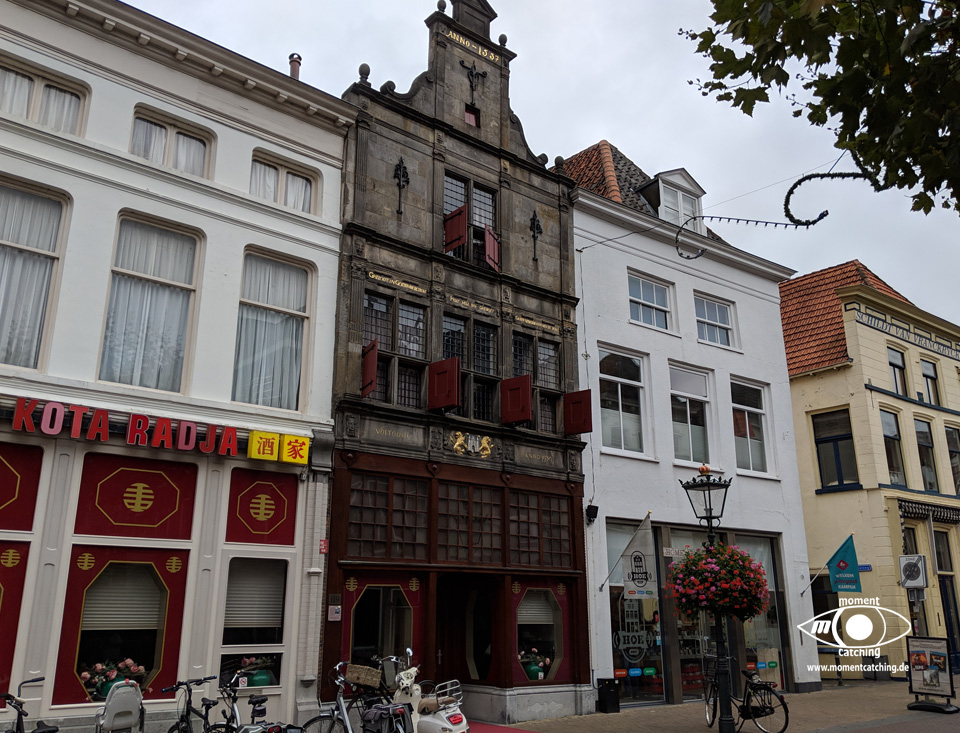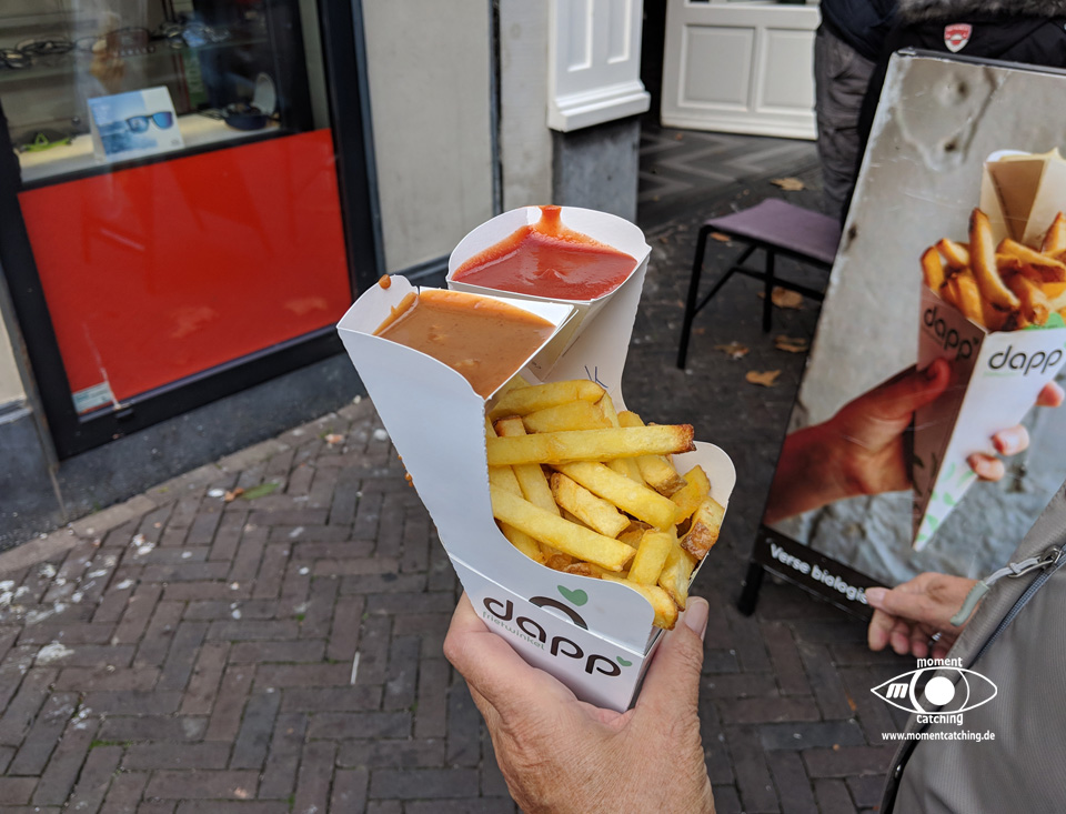 Wir sind mit den Rädern von Hasselt aus nach Zwolle gefahren. Supergut ausgeschilderter Radweg, breit und durchgehend asphaltiert. Da macht das Radfahren so richtig spaß. Der Ort hat uns sehr gut gefallen. Es wimmelt nur so von Menschen der unterschiedlichsten Nationen. Es gibt viele schöne und liebevoll restaurierte, historische Häuser. Wir haben uns hier sehr wohl gefühlt. Wir haben in Zwolle uns Pommes geholt und eine Wurst. Mit den spitzen Tüten standen wir erst etwas ratlos da! Erstmal nichts besonderes, aber wie das serviert wurde ist schon etwas Besonderes. Die Platten der Tische haben quadratische Löcher. Wir haben erst an anderen Tischen beobachtet wo für diese Löcher gut sind. Das Einstecken der Pommestüte in diese Löcher ist eine klevere Idee. Die Pommes sind auch besonders gut. Die werden aus frischen Kartoffeln zubereitet und zweimal fritiert. |