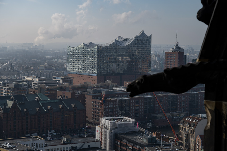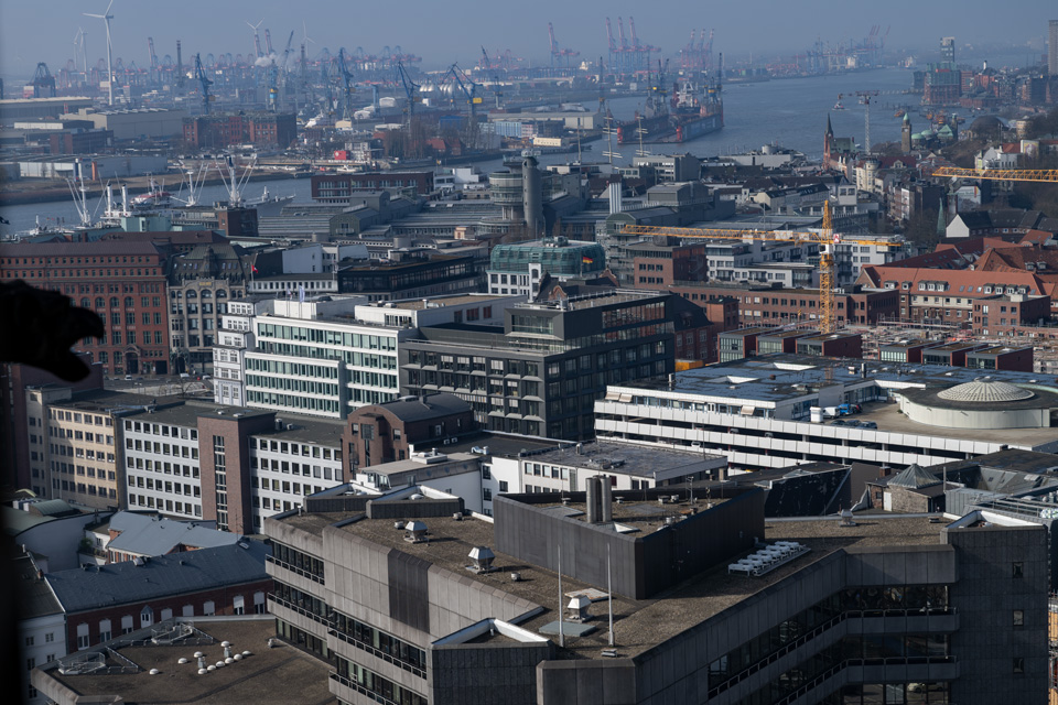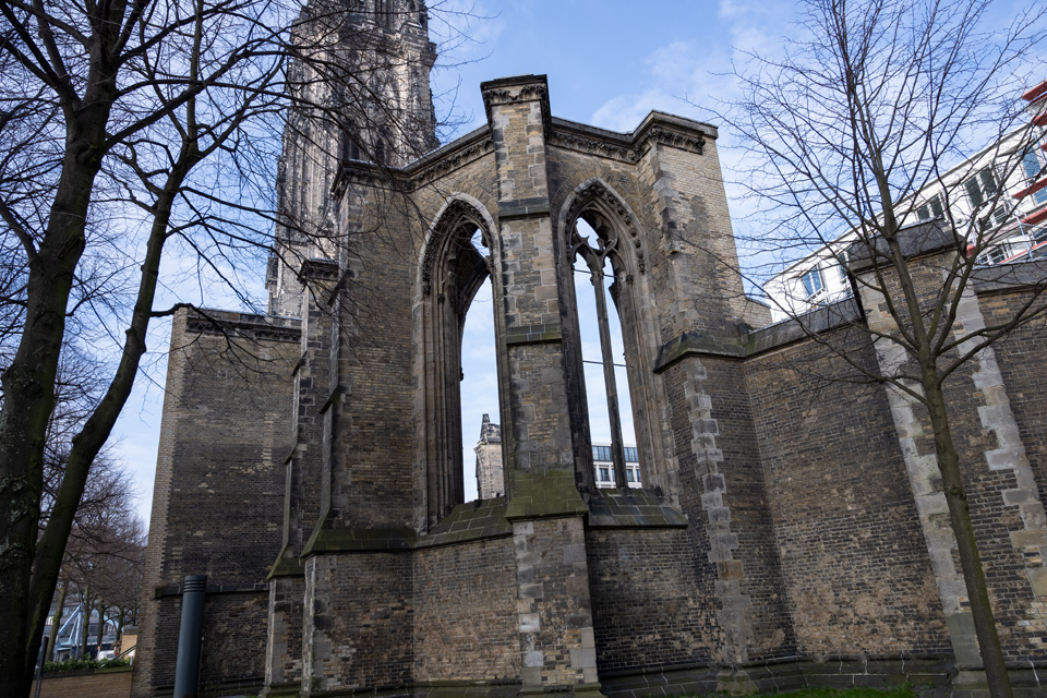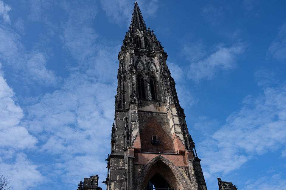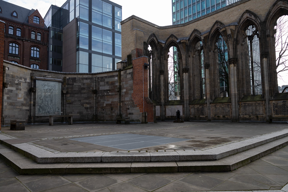 Für heute hatten wir uns eine Auffrischung unserer Eindrücke von dem Umfeld der Binnenalster vorgenommen und Susanne wollte sich ein Nachthemd für ihren geplanten Krankenhausaufenthalt kaufen. Den Rundgang wollten wir erstmal zu Fuß machen und dann eventuell vom Hauptbahnhof die eine Station mit der S-Bahn zum Stellplatz zu fahren. Unser erster POI war die Ruine der Nikolaikirche. Wir konnten mit dem Aufzug in dem übriggebliebenen Glockenturm auf über 80 Meter Höhe steigen, ohne auch nur eine Treppenstufe zu steigen. Besser geht es nicht und wir waren beide von der Aussicht beeindruckt. Das Museum in den noch vorhandenen Kellerräumen der Ruine hat uns sehr beeindruckt. Hauptthema ist hier das Bombardement vom Juni 1943. In drei Schüben haben hier britische und US-amerikanische Bomber große Teile von Hamburg in Schutt und Asche gelegt. Nach eigenen Aussagen sollten diese Bombardements die Zivilbevölkerung treffen, mit dem Ziel sie kriegsmüde zu machen. Nach heutigem internationalem Recht ein klares Kriegsverbrechen. Dumm nur, das Deutschland diesen Krieg angefangen hat und der größte Teil der Bevölkerung dafür war und es auch noch zum Zeitpunkt der Bombardements war. Was für ein Wahnsinn, der tausenden von unschuldigen Menschen das Leben kostete, für eine menschenverachtende Staatsmacht mit pervertierter Argumentation. Aus Sicht der Nationalsozialisten waren die Juden an dem Krieg schuld. Da fehlen einem die Worte. Der Besuch dieses Museums hat uns sehr tief beeindruckt.
