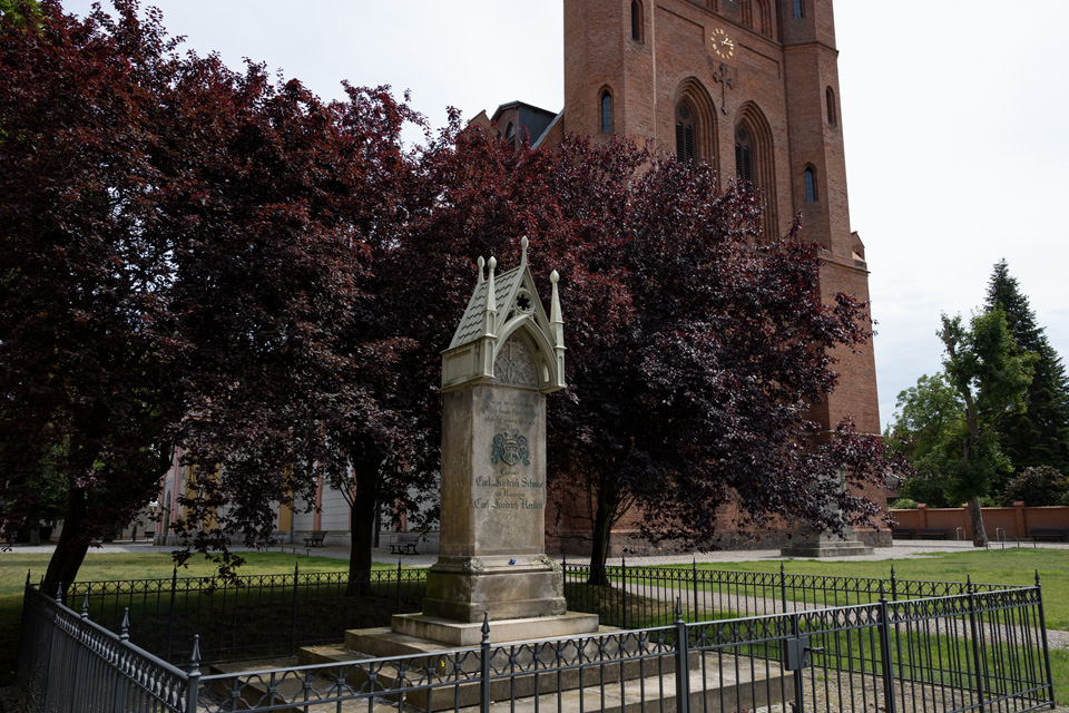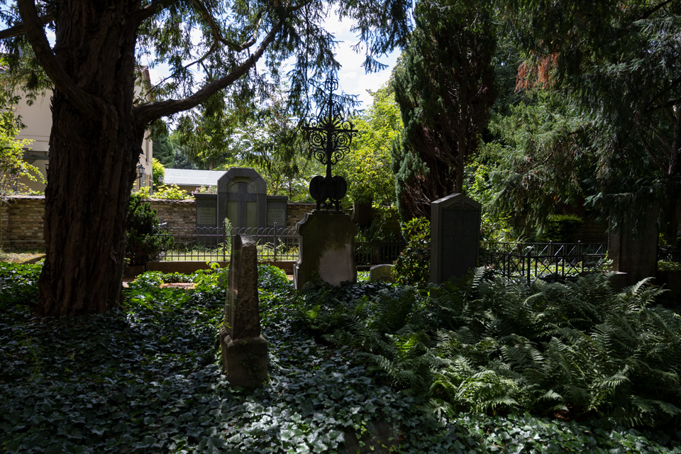 Nach Schloss Sanssouci wollten wir in der Gaststätte an der historischen Mühle Kaffee trinken, aber Susanne hat dort nichts gefallen. Wir sind weiter gezogen. Am Krongut Bornstedt wieder angekommen haben wir uns den gegenüberliegenden Friedhof angesehen. Er gehört zur Dorfkirche Bornstedt. Er beherbergt über 500 prominente Personen mit entsprechenden Gräbern. Einige davon sind über 400 Jahre alt. Beim Weitergehen haben wir uns kurz verlaufen. 500 Meter um sonst von Susannes 13500 Schritten.