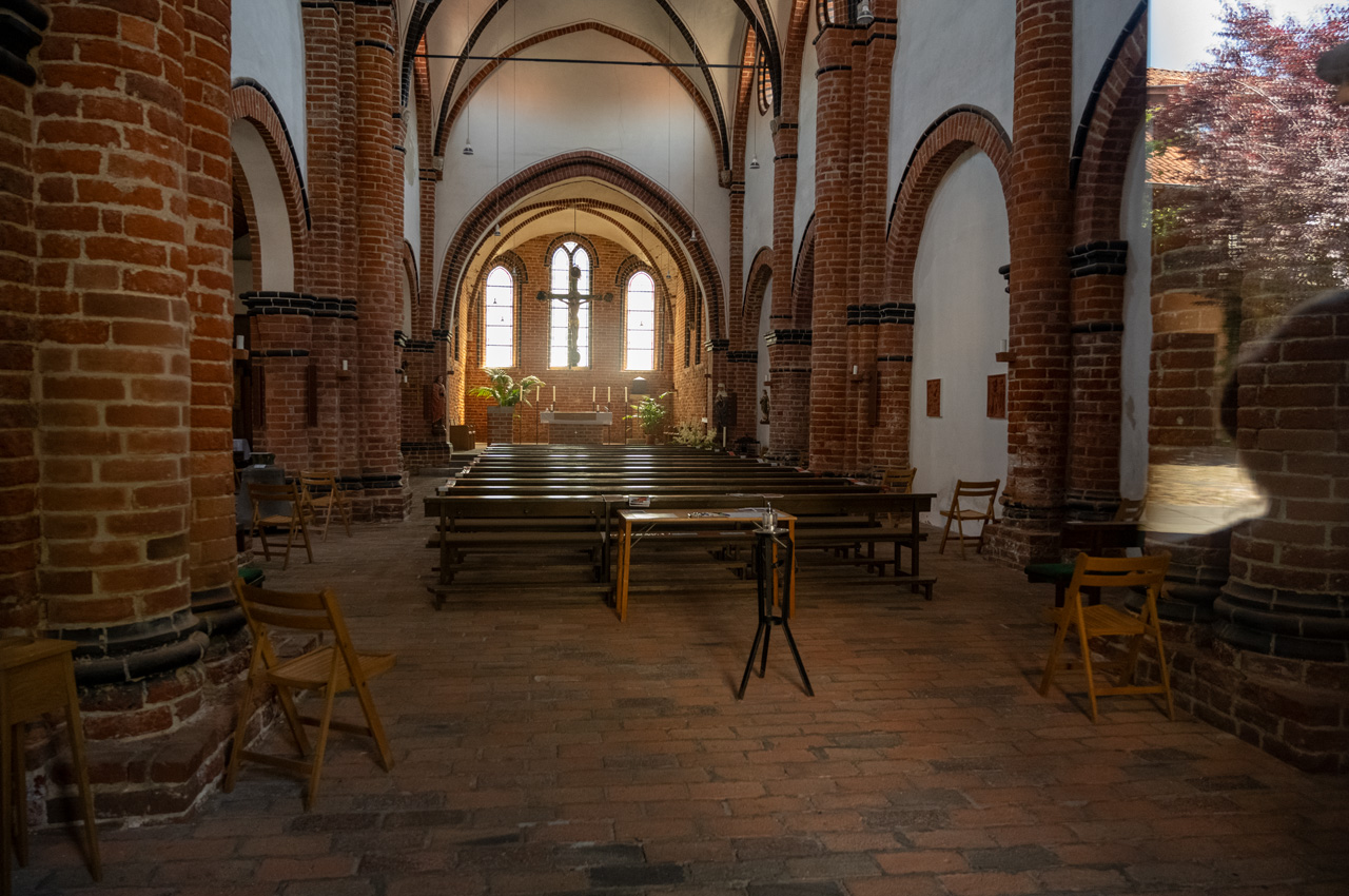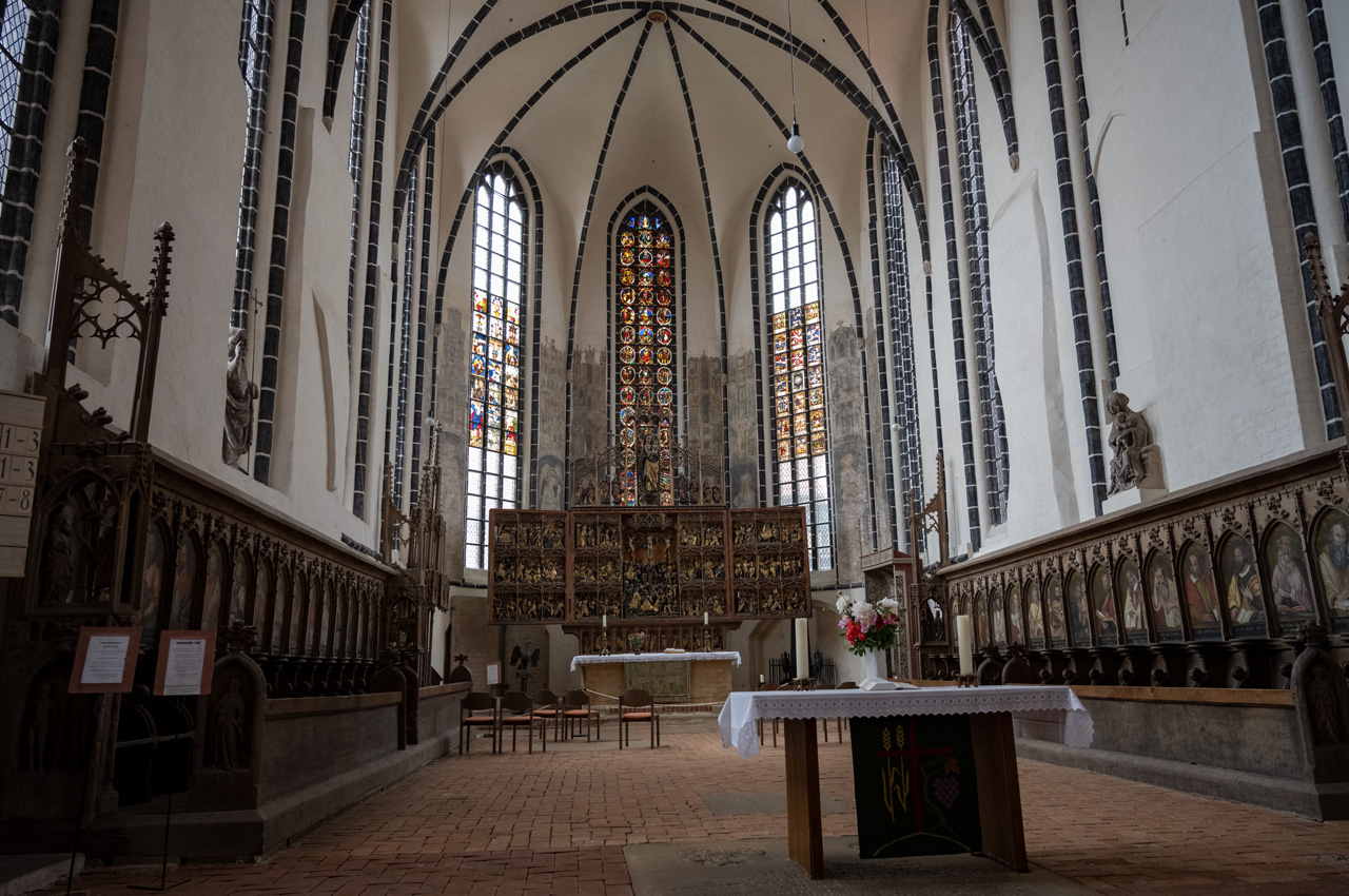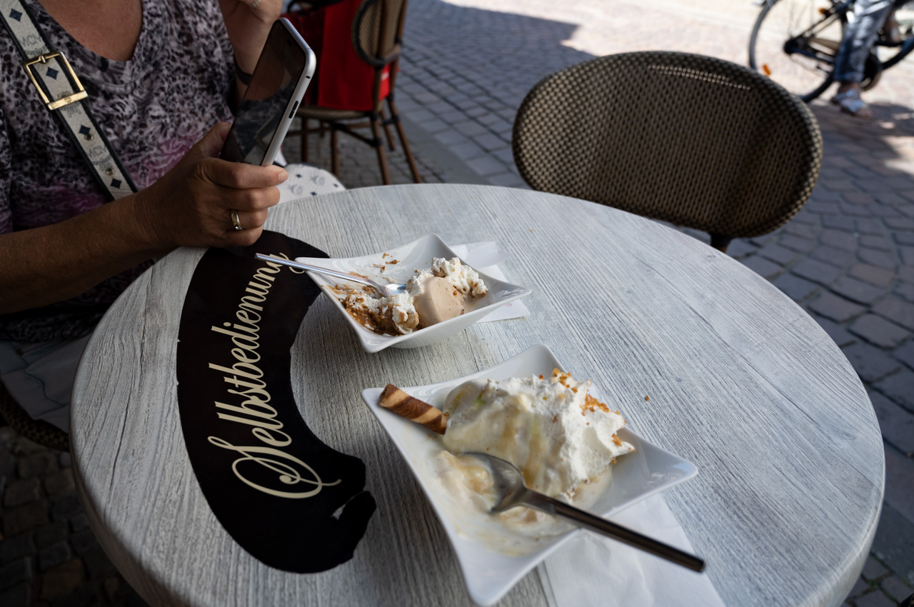 Nach meinem Ausflug sind wir nochmals in die Altstadt gelaufen. Auf dem Hinweg zur Katharinenkirche waren wir an der katholischen Lorenzkirche. Man konnte hier in einen Vorraum und wenigstens durch eine Glasfront in die Kirche sehen. Bei der Katharinenkirche hing leider noch das selbe Schild an der Eingangstür wie schon am Dienstag. "Leider bleibt unsere Kirche heute aus organisatorischen Gründen geschlossen". Alo wir standen wieder vor verschlossener Tür. Wir haben eine Außenrunde gedreht und sind dann zurück über die Breite Straße zum ehemaligen Neustädter Rathaus. Dort hatten wir auf dem Hinweg ein Eiscafe entdeckt. Hier haben wir uns jeder einen Eisbecher gegönnt. Das Eis war gut und preiswert. Danach ging es weiter zur Konditorei Kruse. Susanne hat hier noch zwei Baumkuchen zum Verschenken gekauft. Jetzt zog es uns zurück zum Womo. Wir hatten inzwischen 33°C und da hatten wir nicht mehr die geringste Lust noch in der Stadt herumzulaufen. Am Womo habe ich endlich mal wieder einen Mittagsschlaf gehalten. Im Schatten unter unserer Markiese ließ es sich aushalten.