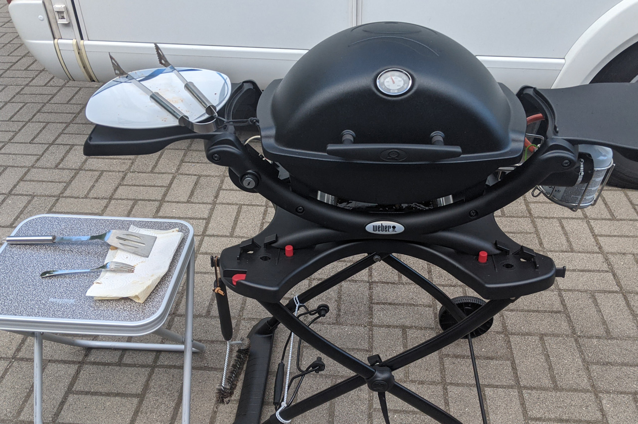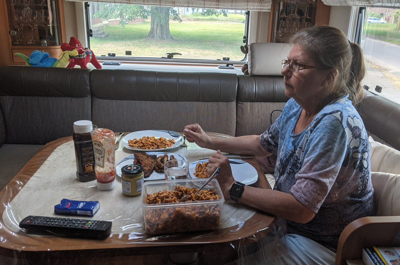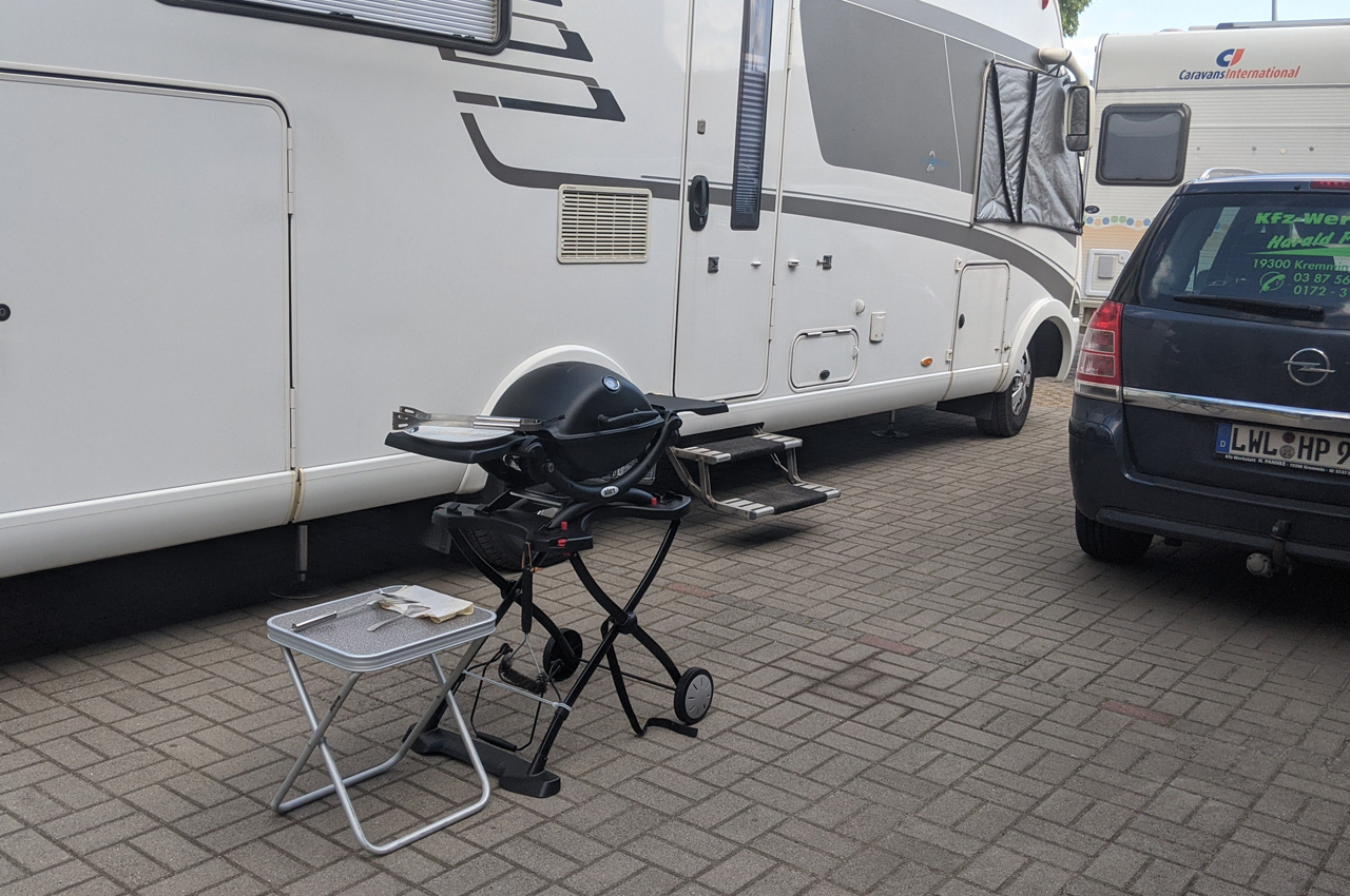 Zum Abend habe ich den Grill aufgebaut und wir haben Schweinebauchscheiben und Würstchen thüringer Art aufgelegt. Susanne hatte schon zu Hause den leckeren mexikanischen Nudelsalat gemacht. Jetzt konnten wir vor der Werkstatt Pannke so richtig schlemmern. Sehr idyllisch.