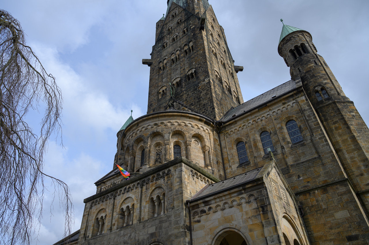 Der Weg vom Stellplatz zur Altstadt von Rheine ist immerhin etwas mehr als 3km lang. Wir haben uns des Wetters wegen trotzdem entschieden ihn zu Fuß zu gehen. Der Schnee war weitestgehend abgetaut und die blühenden Sträucher und Blumen entfalteten wieder ihre Blütenblätter. Unser erster POI war die St.-Antonius-Basilika. Ein tolles Bauwerk, es ist durch und durch noch im romanischen Baustil. Davon gibt es sicher nicht mehr so extrem viele Gebäude. Die meisten wurden im Laufe der Jahrhunderte durch andere Baustile verändert. Von der Kirche ging es zur Brücke über die Ems und danach waren wir in der Altstadt mit der Fußgängerzone. Hier gab es tatsächlich noch viele historische Gebäude, teilweise mehr als 300 Jahre alt. In der St. Dionysius Kirche wurde die Orgel bespielt mit gewaltiger Lautstärke. Kein Wunder, sie verfügt über 4000 Pfeifen. Die größte davon ist 5,60 Meter lang. Nach der Kirche haben wir uns den Falkenhof angesehen, der frührere Sitz der Stadtverwalter. Danach waren wir am alten Rathaus, ein eher schlichtes Gebäude. Von da aus ging es zurück zur Ems, hier gab es eine Grillwurst. Am linken Ufer der Ems entlang sind wir dann in Richtung Tierpark und Saline gelaufen. Am Abzweig hinter der Bahnlinie, wo es zu unserem Stellplatz ging, hat sich Susanne entschieden, dass wir nun die Biege über die Saline und dem Kloster Bentlage auch noch machen. Ich bin stolz auf mein Frauchen, wie sie trotz ihrer kaputten Kniee, noch mit mir durch die Gegend läuft.