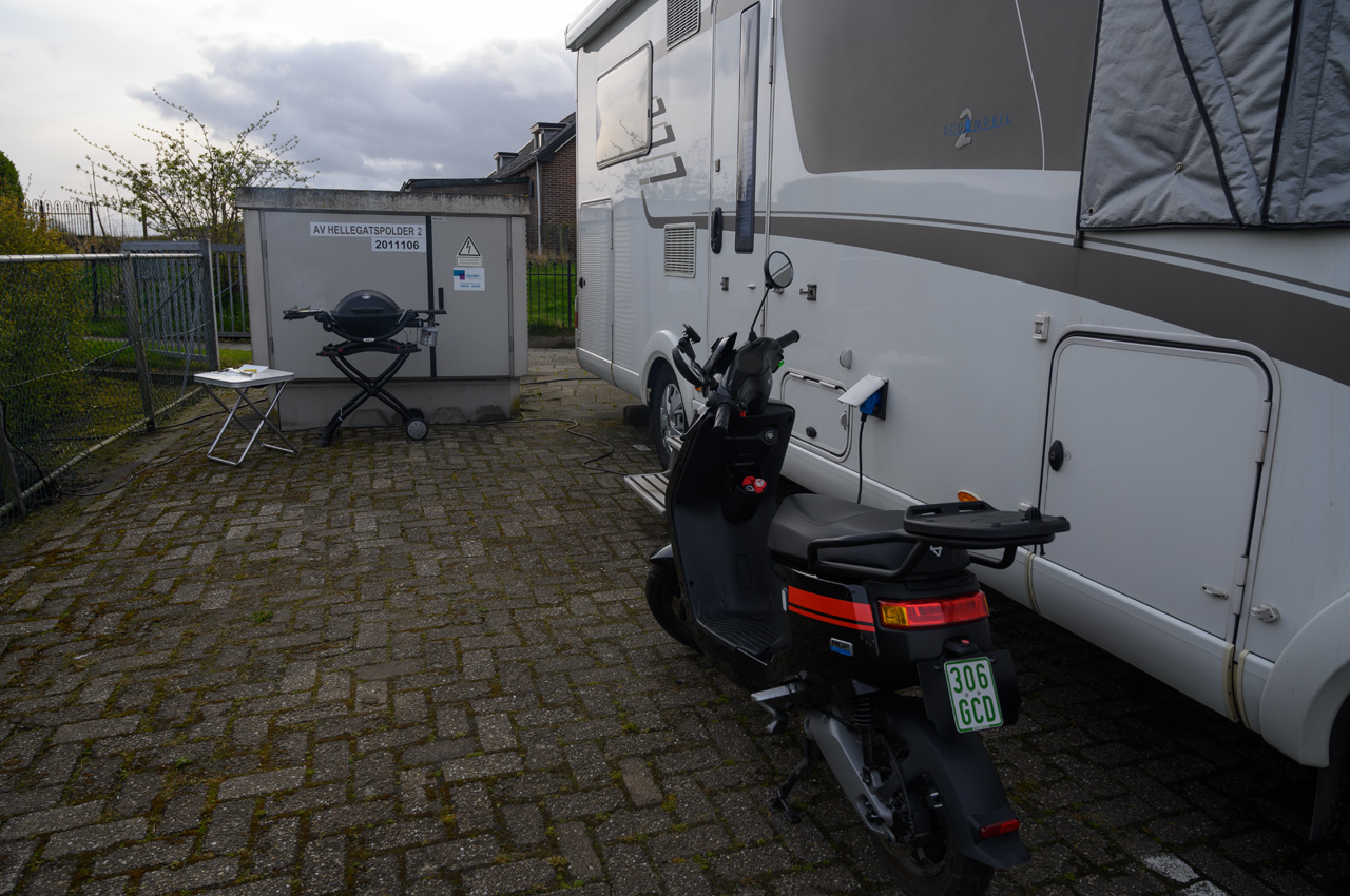 Bevor wir den Stellplatz angesteuert haben sind wir in Lisse im Jumbo gewesen und haben für das Zusammentreffen mit Vivien-Sara und Mario noch die restlichen Lebensmittel besorgt. Unser Platz war wie gewünscht für uns reserviert und man hat uns schon erwartet. Abweichend unser sonst üblichen Abläufe bei Ankunft, haben wir als erstes Wasser gebunkert und Grauwasser abgelassen. Bevor wir dann endgültig in unsere Stellfläche gefahren sind haben wir den NIU ausgeladen, weil ein kleines Trafohäuschen sonst stört. Wir haben uns schon mal die Hütte angesehen, in die Vivien-Sara und Mario morgen einziehen werden.