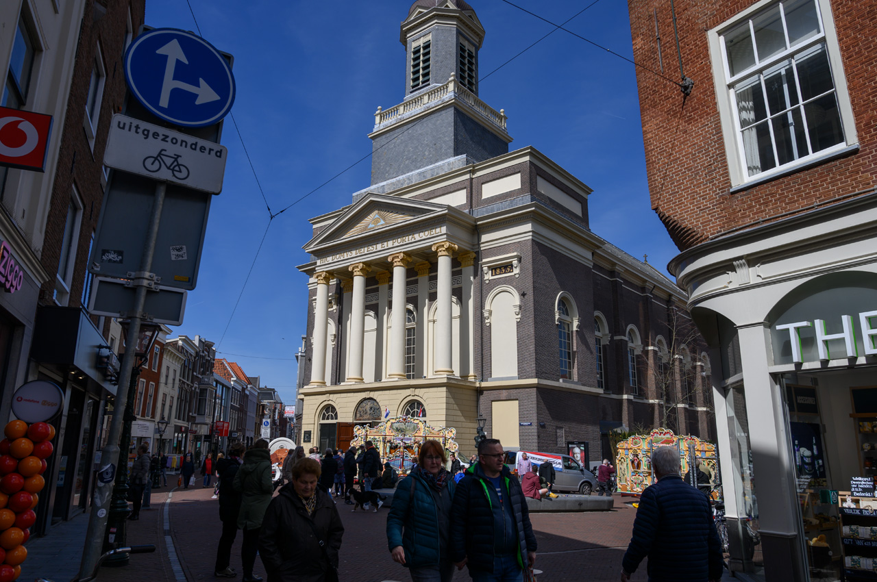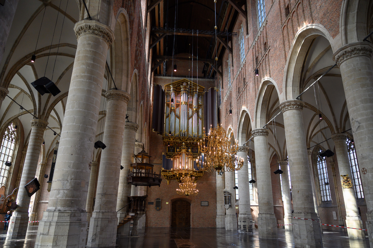 Nach dem gemeinsamen Frühstück sind wir gestartet. In Leiden haben wir ein nagelneues, unterirdisches Parkhaus gefunden in unmittelbarer Nähe der Molen De Valk. Von da aus waren es nur noch wenige Schritte in die Altstadt von Leiden. Dort haben wir die Pieterskerk besichtigt, ein kulturhistorisches Denkmal Leidens von hohem Rang, die heute nur noch als Veranstaltungshalle genutzt wird. Der ehemalige Hochchor wird heute als Cafe und Bar benutzt. Die Kirche hat in den 900 Jahren ihrer Geschichte viele Veränderungen erfahren und prominente Persönlichkeiten haben sie besucht. Wohl der prominenteste Gast war George Bush Senior. Dieses gothische Gebäude beeindruckt durch seine Größe und besonders durch seine Höhe mit den monumentalen Holzdecken. Wir waren alle vier sehr beeindruckt von diesem Gebäude. Unser Spaziergang führte uns dann weiter vorbei am Theater und am Rathaus zur Gracht am großen Markt. Hier wollten wir die Hoglandse Kerk besichtigen, die war aber leider verschlossen. Schon vorher begegneten uns vereinzelt Orchestrions auf Rädern, am Platz der Hartebrugskerk, standen fünf Stück und eine sechste wurde gerade herangefahren. Anscheinend spielt sich hier heute ein Wettbewerb zwischen diesen Museumsmaschinen ab. Sie machen aber eine witzige Rumpelmusik und waren ja mal die Vorläufer der Musikbox. Von hier aus ging es wieder zurück zum Auto.