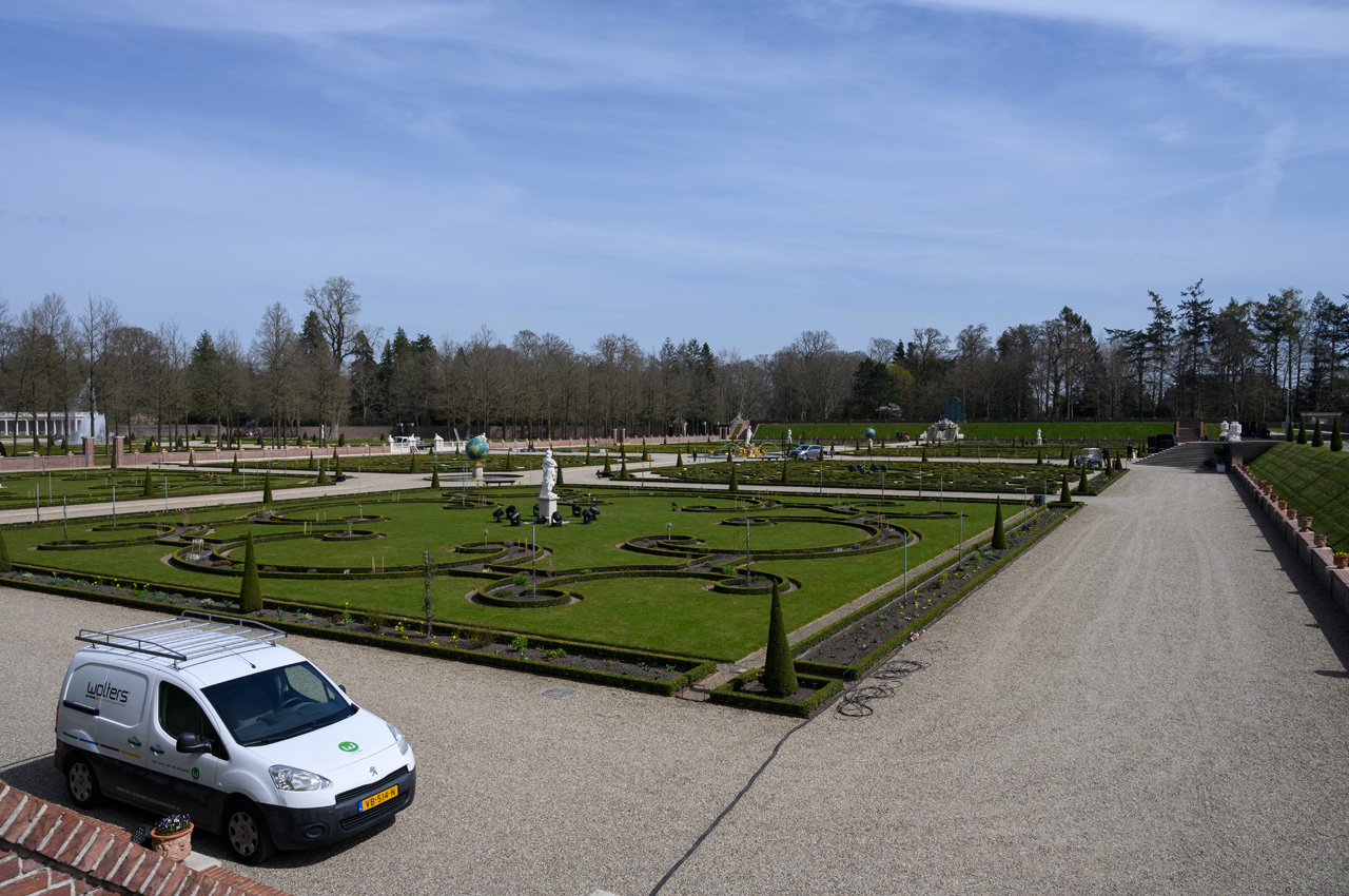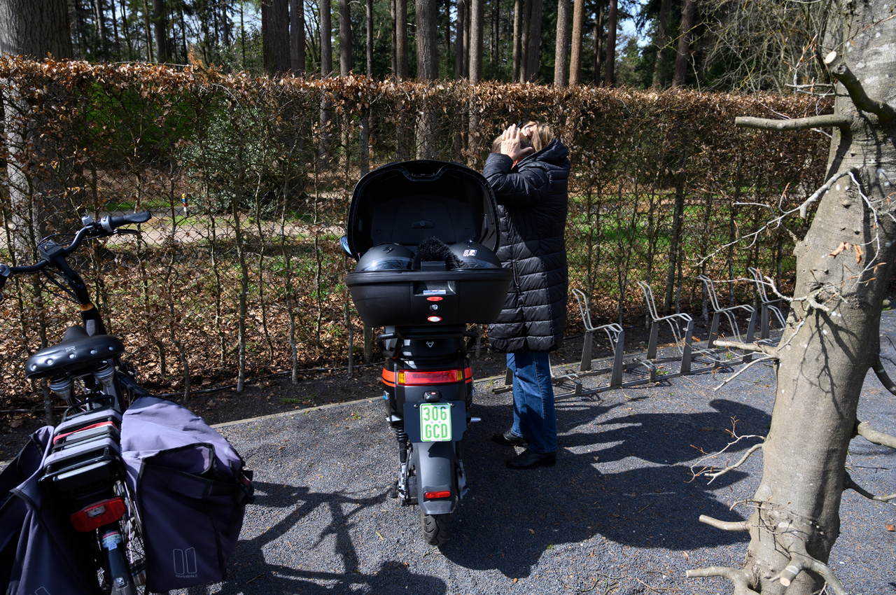 Nach einer absolut ruhigen Nacht, begrüßte uns heute am Morgen Sonnenschein bei einer Temperatur von 14°C. Das hatten wir ja schon lange nicht mehr. Nach dem Frühstück, heute gab es aufgewärmte Brötchen, haben wir noch bis zum Mittag relaxt. Ich habe begonnen meinen Bilder und Videoberg abzuarbeiten. Nach dem Mittagskaffee sind wir auf den NIU gestiegen und sind in Richtung Paleis Het Loo gefahren. Der Parkplatz war noch sehr leer, was sich relativ schnell erklären ließ, nach dem wir erfahren haben, dass das Museum und der Schlosspark erst nächste Woche öffnen. Lediglich der große Landschaftspark ist geöffnet. Direkt am Schloss habe ich einen Hinweispfeil auf einen Seitenweg entdeckt. Zwei Bauarbeiter, die an dem Weg gearbeitet haben, haben uns zu verstehen gegeben, dass wir einfach durchgehen sollen. Als wir einen ersten Blick in den Barockpark werfen konnten, kam eine junge Frau mit einem Funkgerät auf uns zu und machte uns klar, dass wir hier gar nicht sein dürfen. Park und Museum öffnen erst am Freitag, passend zu Ostern. Sie hat uns freundlich aber bestimmt wieder bis zu zu unserem Durchschlupf gebracht. Nun konnten wir lediglich noch eine kleine Runde durch den Landschaftspark machen. Eigentlich hätten wir sogar für diesen Park Eintritt zahlen müssen, was wir aber erst am Ausgang kapiert hatten.