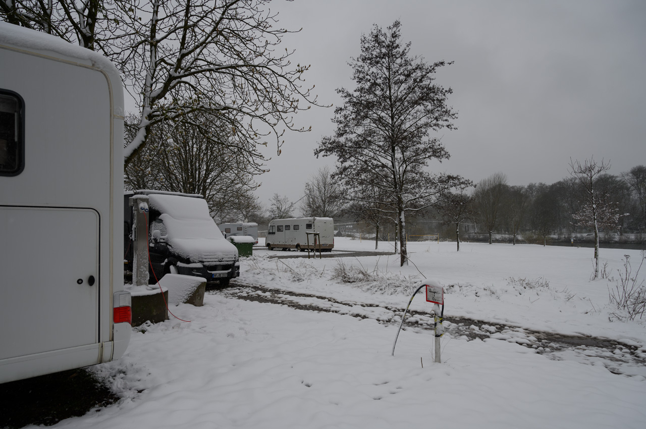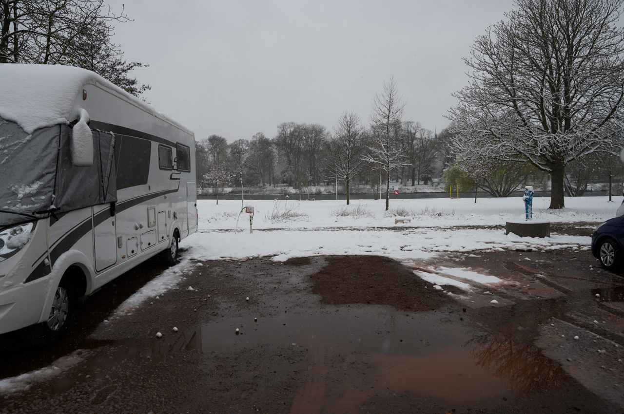 Als wir heute schlafengingen sahen wir schon im Licht der Parkplatzlaternen, dass kleine Schneeflocken herum tanzten. Als wir dann am Morgen aufgestanden sind, war der Winter wieder zurück gekehrt. Es lagen ca. 10 cm Schnee und es schneite immer noch. Ich habe mich davon nicht abschrecken lassen und bin wie geplant zum Bäcker gelaufen. Der größte Teil des Weges war auch schon oder noch schneefrei. Es war 1°C Außentemperatur und der Boden hatte keinen Frost.