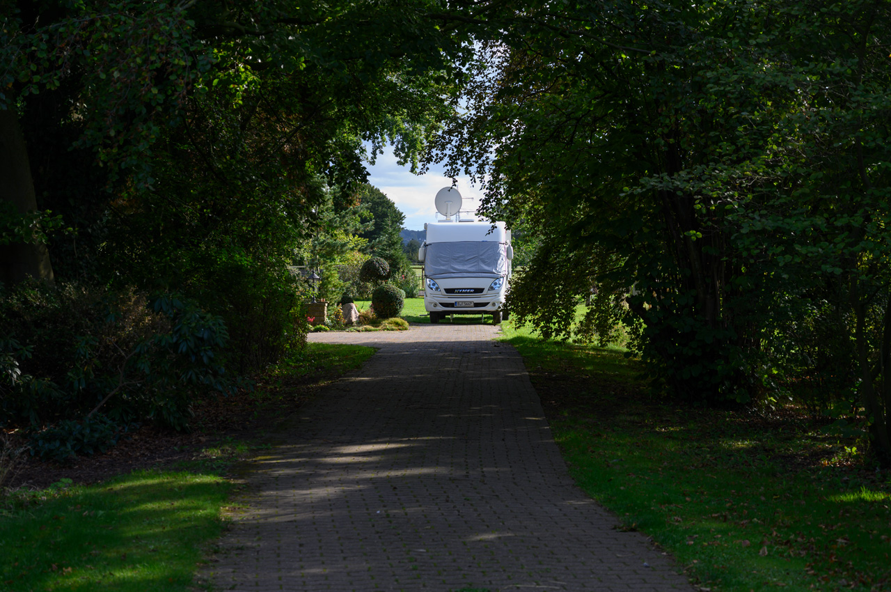 Unser Weg führte uns durch schöne Landschaft und da es Sonntag war, waren auch keine Lkw´s unterwegs. Also haben wir relativ früh auch unseren geplanten Stellplatz erreicht. Was wir da sahen, gefiel uns gar nicht. Massen von Wohnmobilen und das ganze unter einem endlos anmutendem Laubdach. Satellitenempfang ist hier wohl nicht zu erwarten. Das für drei Tage Tage, gefiel uns absolut nicht. Wir haben uns nach einer Alternative im Internet umgesehen. Wir haben einen Platz an einem Hotel im Süden von Bremen gefunden. Dort hat Susanne vorsichtshalber angerufen, ob auch noch etwas frei ist. Eine halbe Stunde später sind wir dort eingetroffen. Wir haben einen guten Platz und konnten problemlos den NIU auspacken.