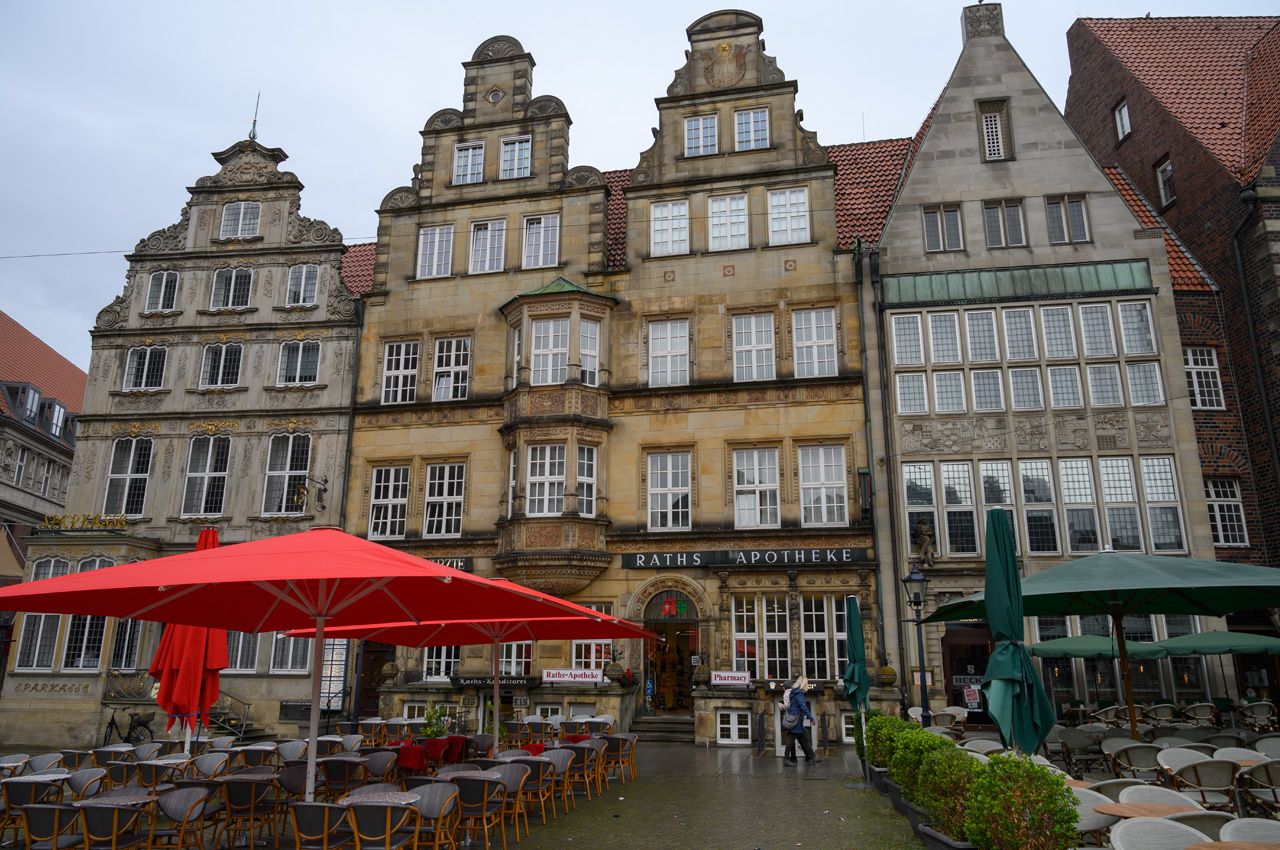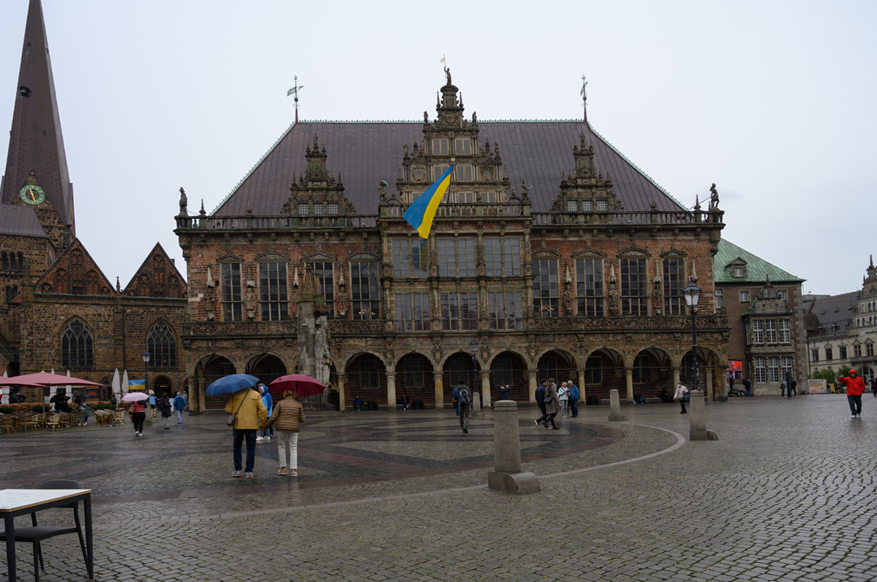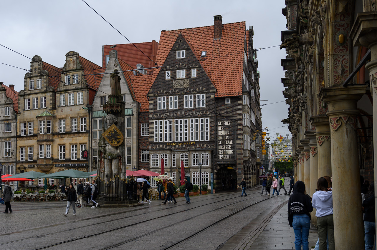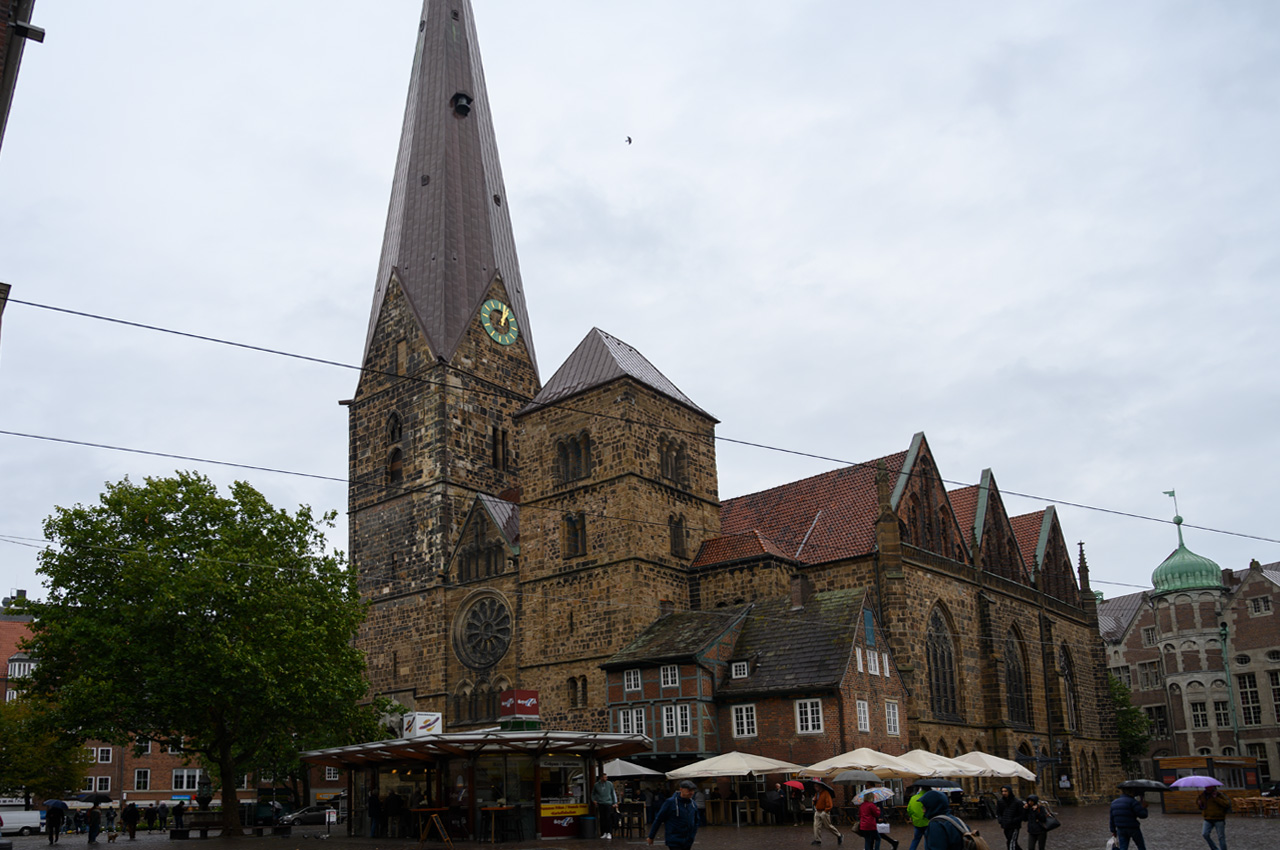 Schon in der Nacht hatte es angefangen zu regnen und auch als wir aufgestanden sind hat es noch geregnet. Auf dem Weg zum Bäcker hatte ich Glück da hat der Regen mal eine Pause gemacht. Da der Wetterbericht komplett für den ganzen Tag Regen vorhergesagt hat, war es eigentlich egal wann wir starten, die Wahrscheinlichkeit, dass wir nass werden, ist sehr hoch. So gegen 11:00 Uhr sind wir dann mit dem NIU in die Altstadt aufgebrochen. In der Nähe der Böttcherstraße haben wir unseren NIU abgestellt. Schon als wir in die Böttcherstraße eingebogen sind, hat es wieder etwas stärker angefangen zu regnen und das hat tapfer bis zur Rückkehr zum Womo durchgehalten. Echtes Mistwetter. Wir haben uns aber nicht die Laune vermießen lassen und sind durch die Böttcherstraße spaziert. Danach sind wir auf den Marktplatz gegangen und haben dort die schönen historischen Gebäude ringsherum bestaunt. Dieses mal haben wir auch die Kirchen am Marktplatz nicht ausgelassen. Zuerst die Kirche unser Lieben Frauen und danach wollten wir in den Dom, was ber erst um 12:15 Uhr wieder möglich ist. Da wir zwischendurch am Rathaus erfahren haben, dass man die Karten für eine Besichtigung in der Touristeninfo in der Böttcherstraße kaufen muss, sind wir wieder nach dahin zurück. In der Touristeninfo haben wir erfahren, dass heute wegen einer Veranstaltung gar keine Besichtigungen stattfinden. Wir haben aber gleich für morgen zu 12:00 Uhr gebucht und bezahlt, weil diese Besichtigungen wohl sehr schnell ausgebucht sind. Danach ging es zurück zum Dom, der dann nach kurzer Wartezeit auch geöffnet hat. Von dem Dom hatten wir mehr Reichtum und Gestaltung erwartet, da ja Bremen eine sehr reiche Hansestadt war. Trotzdem ein sehr beeindruckendes Gebäude. Nun haben wir noch einen Bummel durch die Einkaufsstraßen rund um den Marktbereich gemacht, bevor wir die Rückfahrt zum Womo angetreten sind.