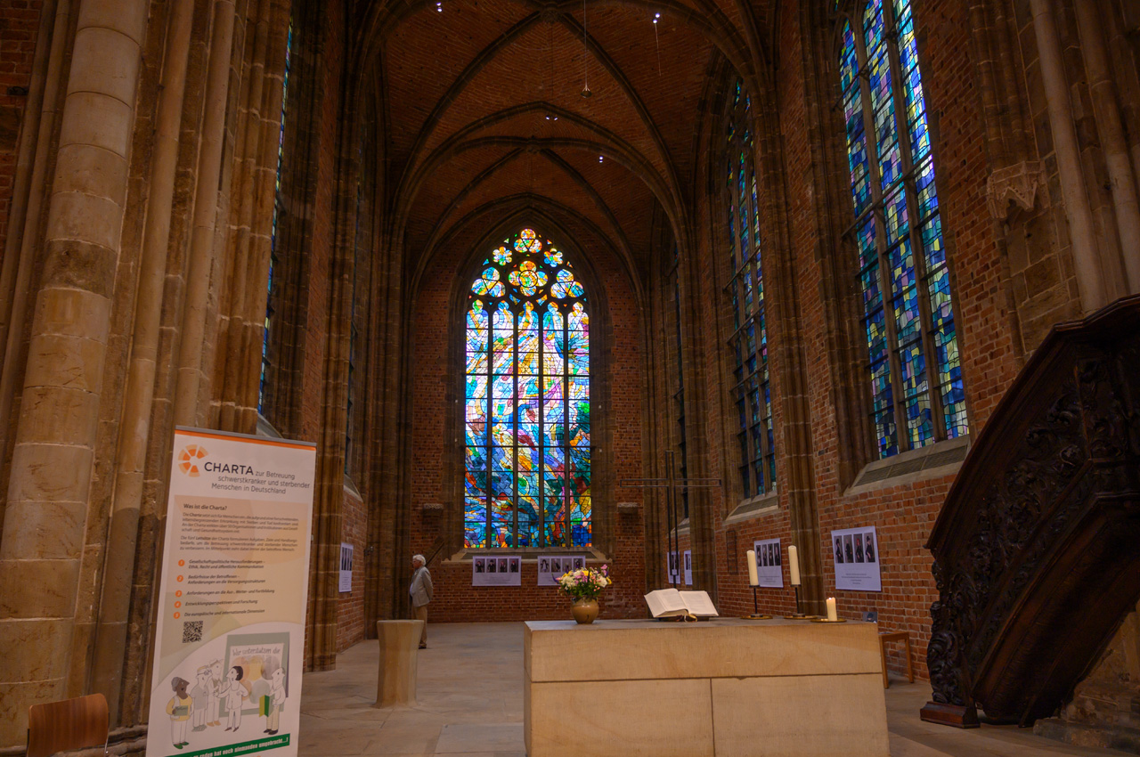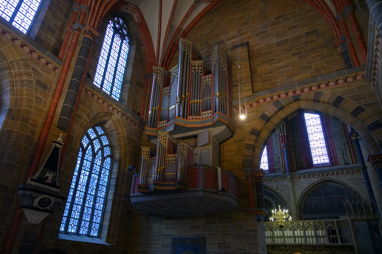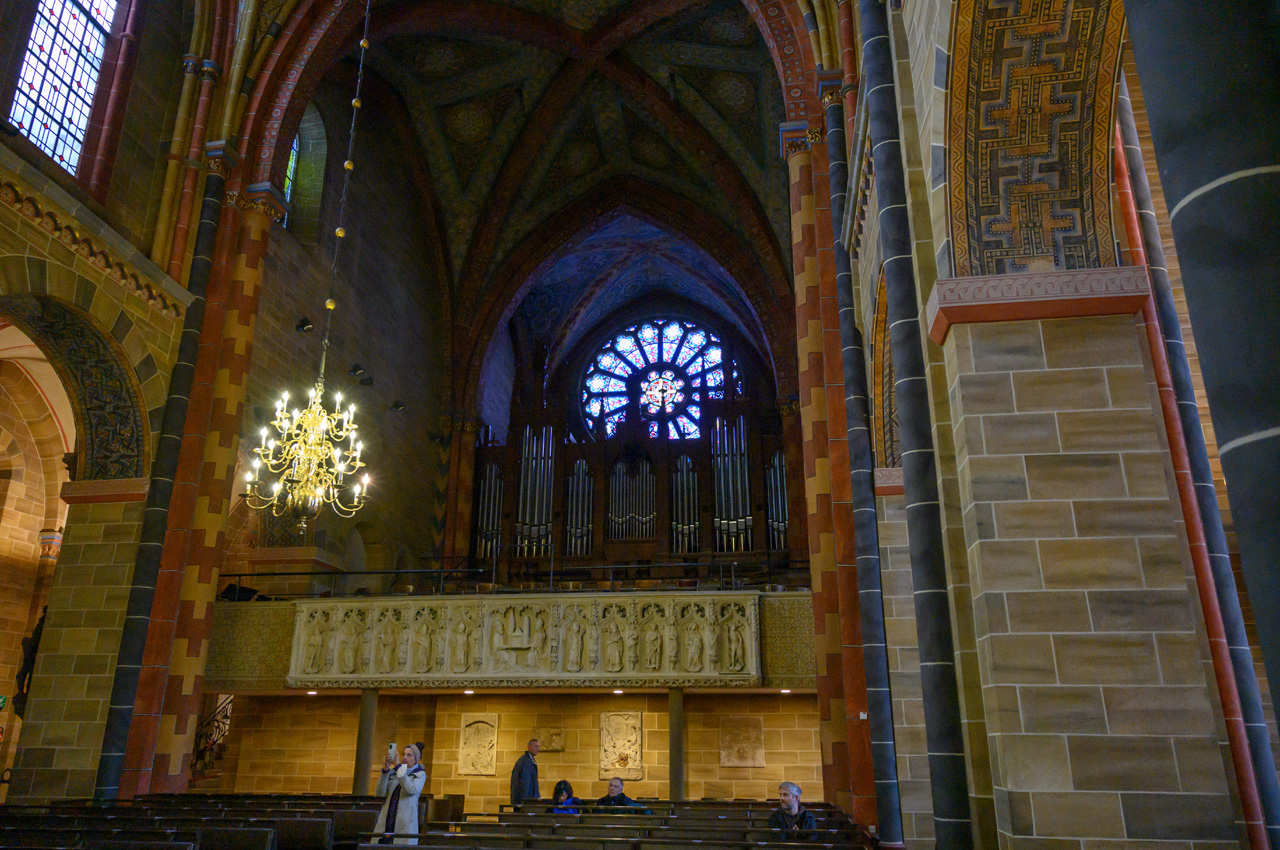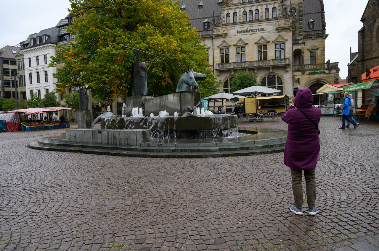 Wir sind mit der Straßenbahn in die Innenstadt gefahren. Schon nach ca. 10 Minuten Fahrt sind wir an der Haltestelle Rathaus ausgestiegen. Von da aus kann man rasch in die Altstadt eintauchen. Vorbei am Neustadtrathaus, der Burg Dankwarderode über den Domplatz zum Dom. Obwohl wir ihn schon kennen, sind wir nochmals hineingegangen. Man entdeckt im Inneren auch immer wieder neue Anblicke und Details. Vorbei an historischen Fachwerkhäusern kamen wir dann zum Altmarkt. Hier steht auch das Altstadtrathaus, das Gewandhaus und die St. Martini-Kirche, die wir uns auch zum wiederholten Male von innen angesehen haben. Weiter nördlich haben wir dann die St. Petri-Kirche gefunden, die aber leider nicht geöffnet war. Weiter ging es dann in Richtung Alte Waage, Andreas-Kirche und die Liberei. Die Alte Waage ist ein sehr sehenswertes Gebäude. Etwas überladen mit Malerei, aber in einem bilderbuchhaftem Zustand. Die St. Andreas Kirche war leider wegen einer Hochzeit nicht zugänglich und die Liberei war auch geschlossen. Also konnten wir uns diese Gebäude nur von außen ansehen! Nun ging es wieder zurück in die Altstadt und dort vorbei am Schlosseinkaufszentrum zum Happy Rizzi Haus. Das ist eine etwas verrückte Architektur und wie heißt es, über Schönheit kann man bekanntlich streiten. Nur 100 Meter weiter kommt man auf den Magniplatz mit der Magnikirche und vielen historischen Gebäuden ringsherum. Die Magnikirche war leider auch, wegen einer Veranstaltung, nicht zugänglich. Nach diesem kleinen Rundgang verspürten wir Kaffeedurst und sind mit der Straßenbahn zurück zum Womo gefahren.
