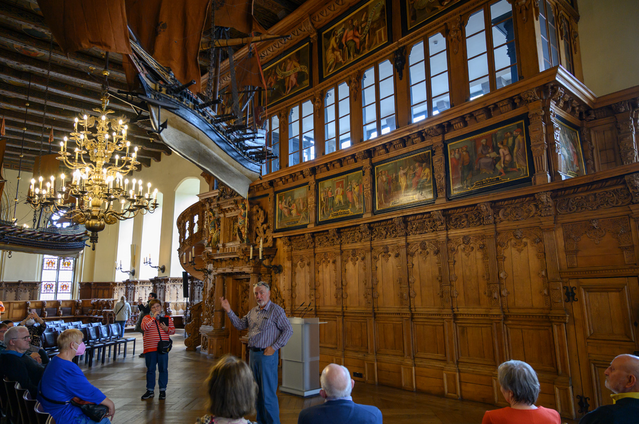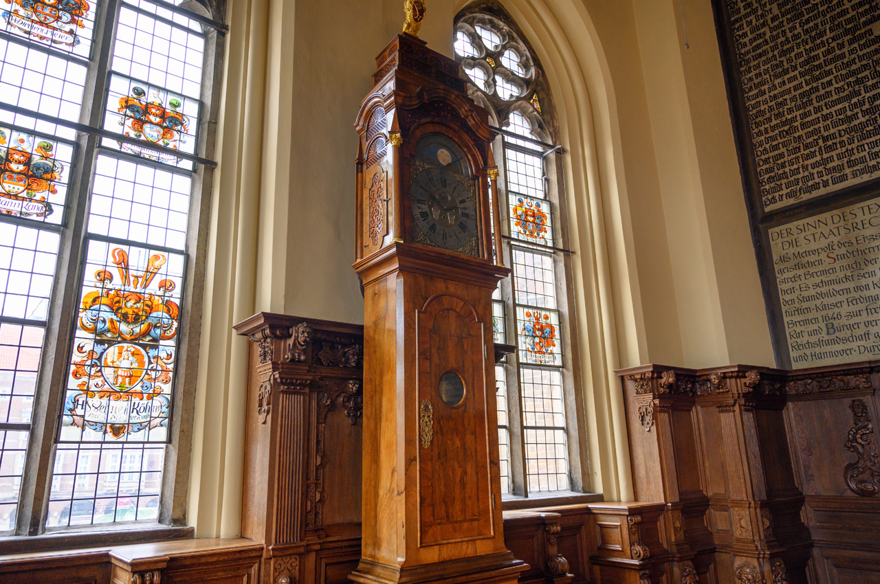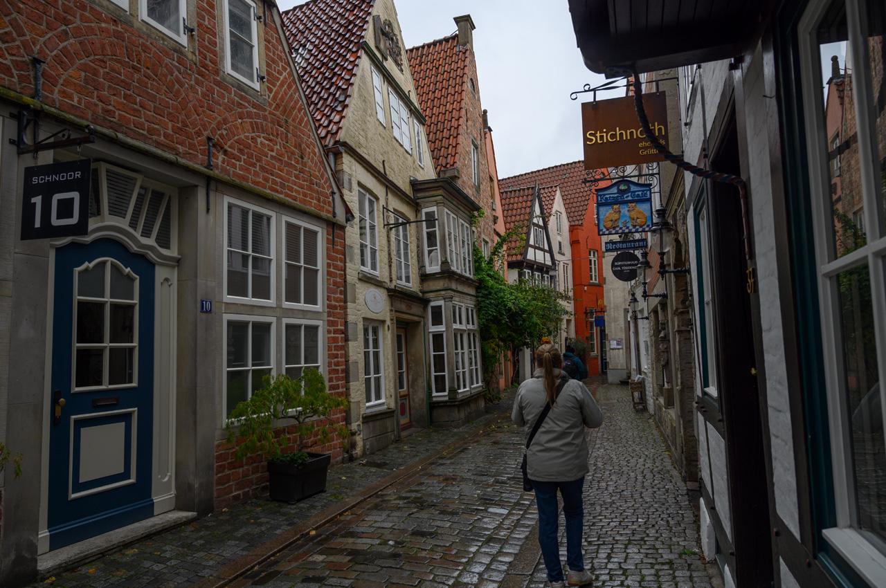 Nach dem Frühstück sind wir ziemlich zeitnah auf den NIU gestiegen um in die Altstadt zu fahren. Prompt fing es auch wieder an zu regnen. Bevor wir um 12:00 Uhr die Rathausbesichtigung antreten sind wir noch etwas durch die Altstadt gelaufen. Dabei haben wir uns die St. Martin-Kirche und die St. Johann Kirche angesehen. Beide Kirchen haben eine sehr schlichte Ausstattung und wenn man sie nicht gesehen hätte, hätte man auch nichts versäumt. Ein besonders schönes Stück der Altstadt ist der sogenannte Schnoor, der älteste noch vorhandene Teil Bremens. Hätte es nicht ständig genieselt, wäre das ganze ein noch besserer Genuß gewesen. Die Führung durch das Bremer Rathaus begann mit etwas Verspätung. Der Guide hat es sehr gut gemacht, aber für unseren Geschmack etwas zu ausführlich. Richtig sehenswert ist eigentlich nur der Festsaal im alten Rathaus. Hier spürt man das historische und den Reichtum der Bremer Bürgerschaft in früheren Zeiten. Als wir das Rathaus verlassen haben, standen wir wieder im Regen. Auch die Rückfahrt zum Womo fand wieder im Regen statt.