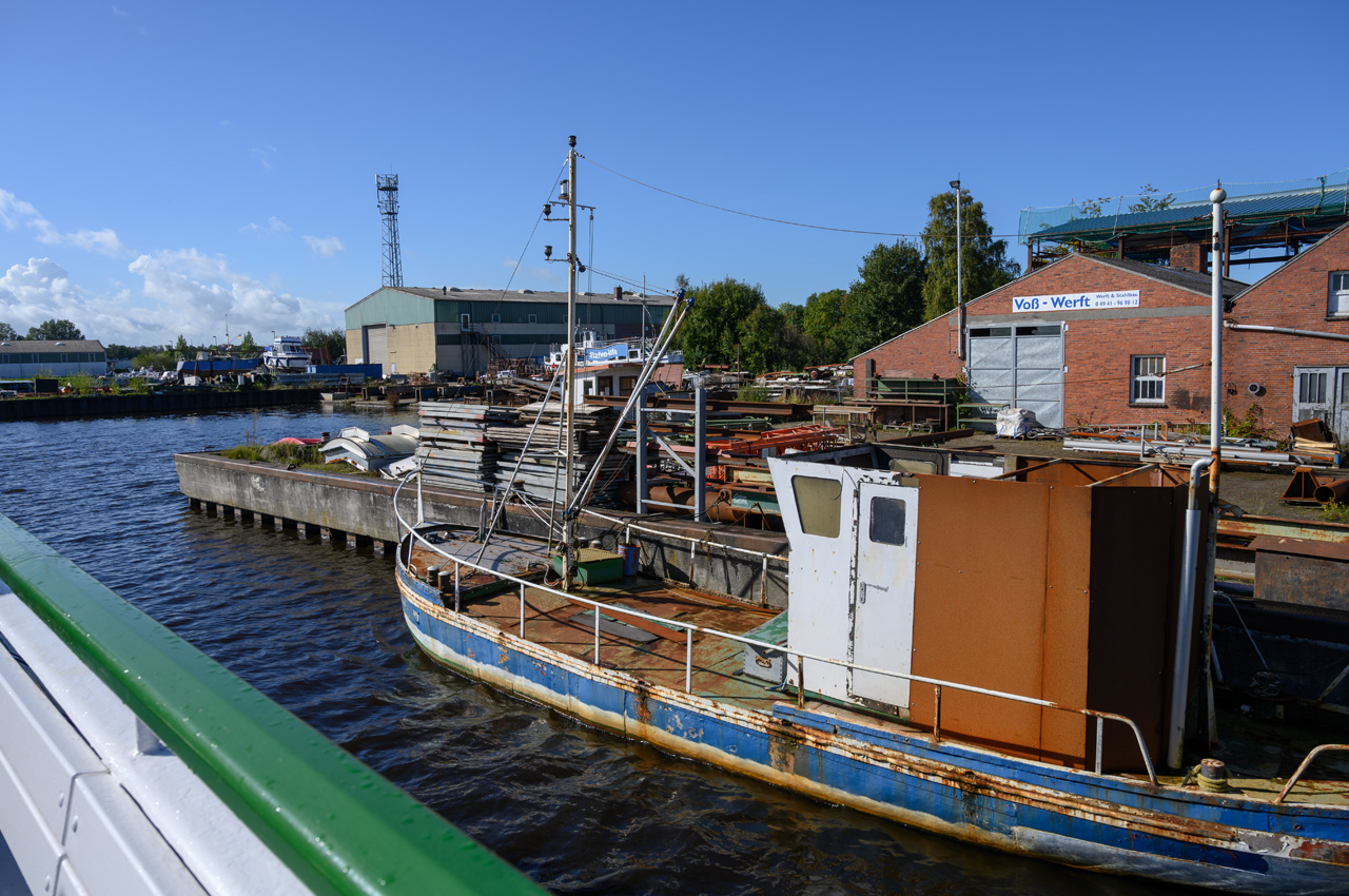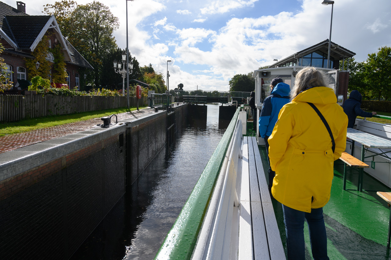 Gegen 13:30 Uhr haben wir uns auf dem Weg zum Hafen gemacht und sind an Bord der MS Aurich gegangen. Wir haben mit ihr eine Fahrt auf dem Jade-Ems-Kanal gemacht. Es ging von Aurich bis zum Hafen von Bangstede bei Ihlau. Hier sitzt die Firma Retek, der größte Lieferant Europas für gebrauchte Autoersatzteile. Sie schlachten Autos aus und verwenden die Teile für den Ersatzteilmarkt. In dem Hafenbecken hat das Ausflugsschiff gewendet und dann ging es wieder zurück. Auf der Strecke gab es eine Schleuse und 5 Klappbrücken, die geöffnet werden müssen. Ein entsprechender Mitarbeiter fuhr mit einem Fahrrad entlang dem Kanal und bediente die Brücken und die Schleuse. Bei kurzen Abständen der Brücken musste er ganz schön radeln. Als wir losfuhren, fing es an zu regnen, auch das musste er ertragen. Die Überwiegende Zeit der Fahrt hatten wir mit dem Wetter großes Glück, es gab sogar etwas Sonnenschein. Das machte die ohnehin sehr liebliche und beruhigende Landschaft noch schöner.