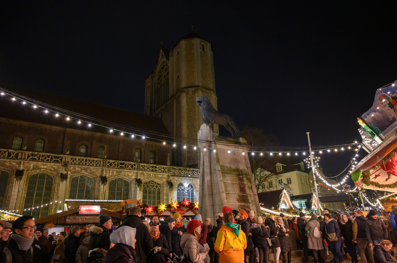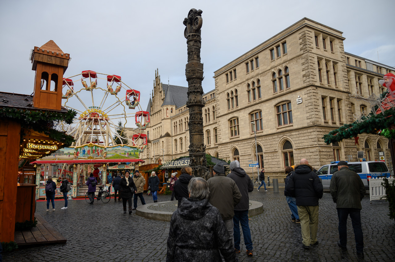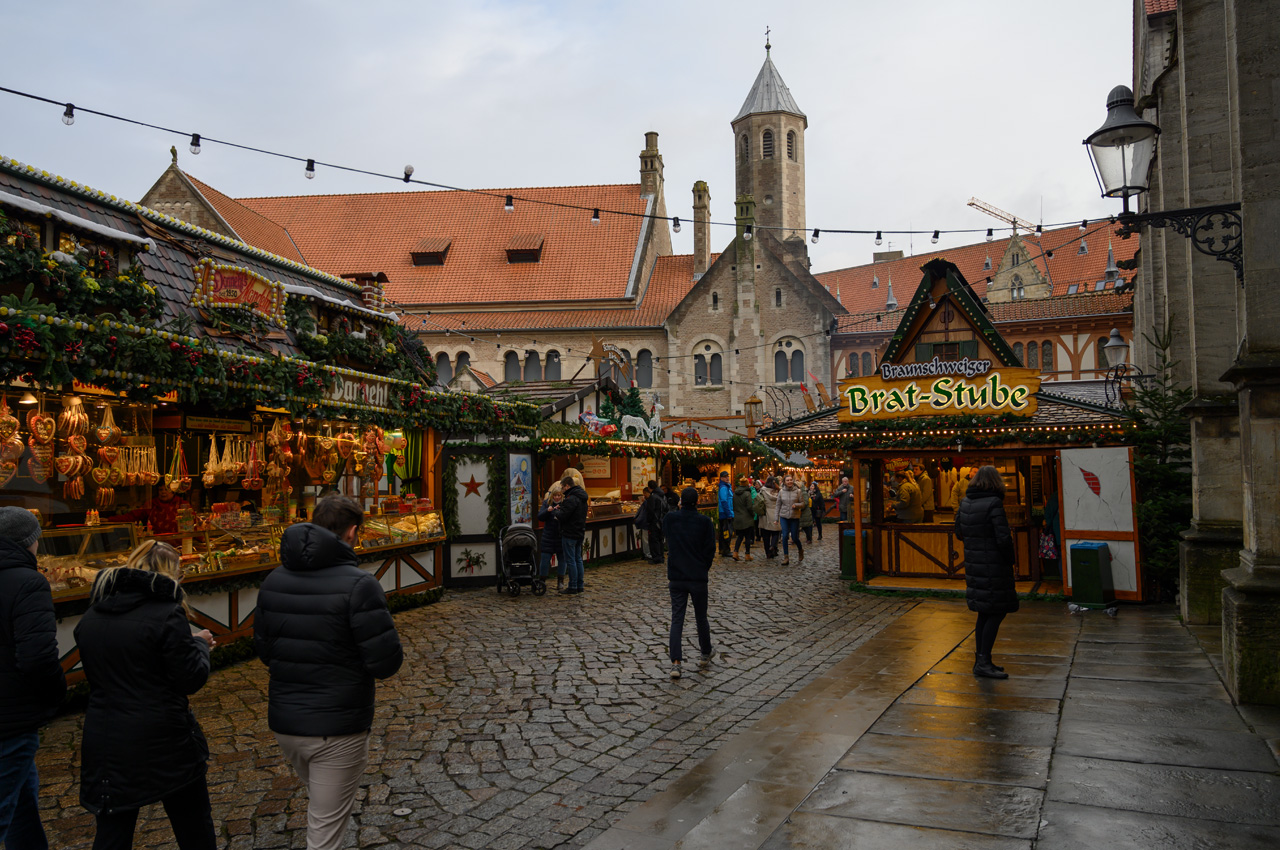 Wir sind erst gegen 12:30 Uhr in die Straßenbahn gestiegen. Die Winterstiefel, die Susanne nach längerer Lagerungszeit heute erstmalig wieder angezogen hat, hatten beim Start schon sehr klebrige Sohlen und haben schon auf der Fußmatte im Womo Spuren hinterlassen. Als wir aus der Straßenbahn gestiegen sind, drohten sie gänzlich die Sohle zu verlieren. Darum führte uns unser erster Weg in das Schlosseinkaufszentrum und dort zu Deichmann. Bis dahin konnte man genau Susannes Spur verfolgen. Wir haben dort schnell Ersatz gefunden und konnten nun mit dem Besuch des Weihnachtsmarktes beginnen. Das gegrillte Würstchen und ein Glühwein sind schon fast obligatorisch bei unseren Weihnachtsmarktbesuchen. Statt des einfachen Glühweines habe ich allerdings einen Eierpunsch getrunken. Susanne hat noch ein spezielles Ringgebäck für den großen Kaffee gekauft und für unterwegs eine Portion Mutzen. Die waren lecker, aber die wir letztens in Greifswald hatten, waren besser. Als wir tiefer in die Altstadt gingen, mussten wir feststellen, dass es dort gar keine Weihnachtsbuden und schon gar keine weiteren Marktflächen mehr gibt. Das ist ja nun für so eine große Stadt wie Braunschweig sehr enttäuschend.