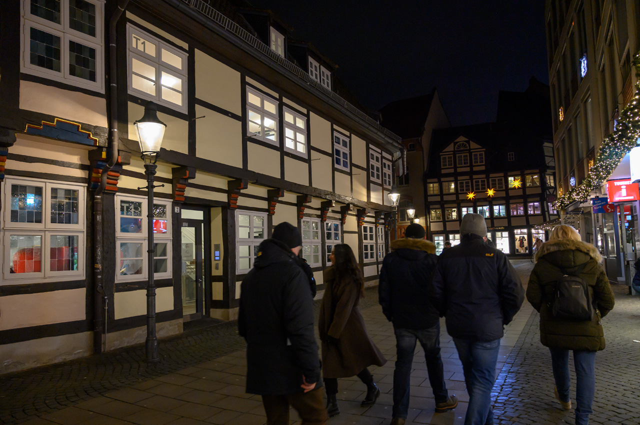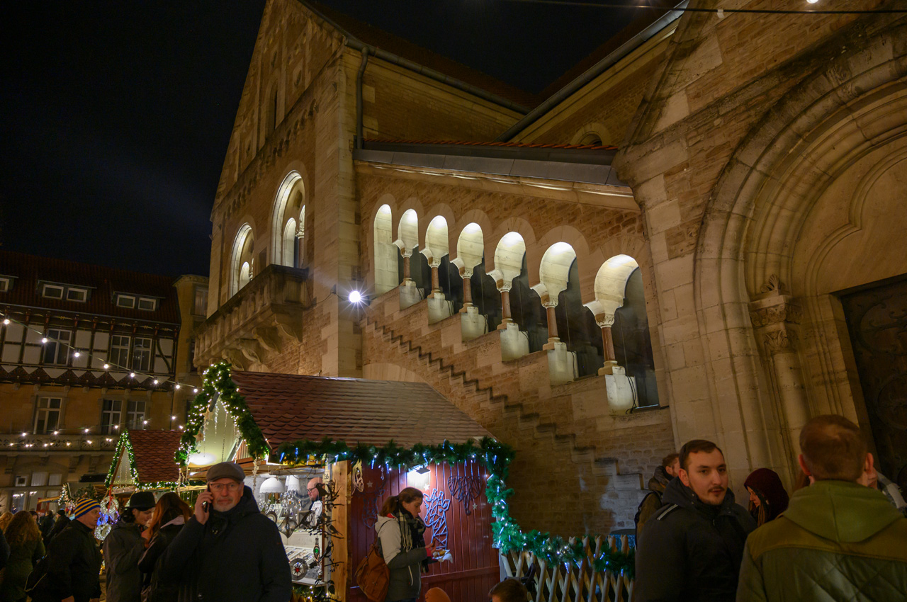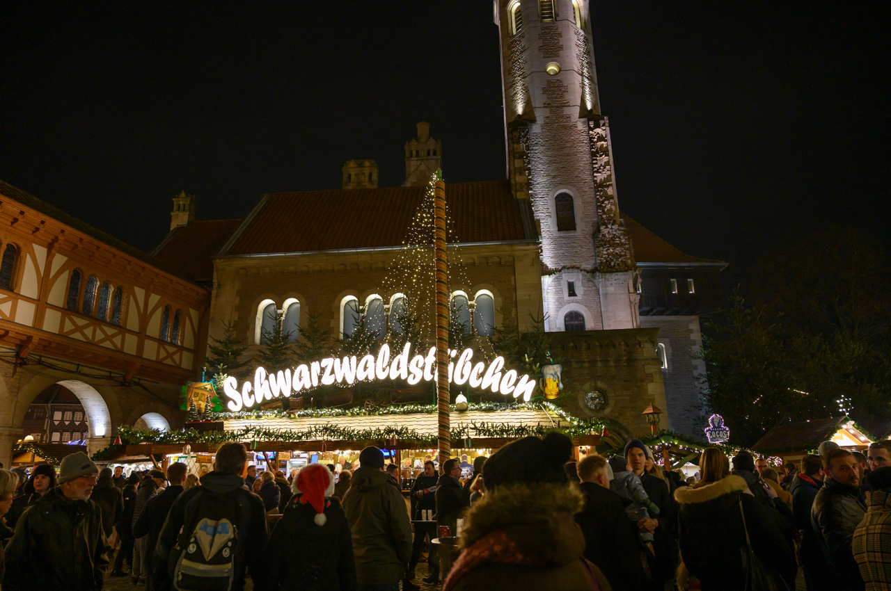 Wir sind erst gegen 12:30 Uhr in die Straßenbahn gestiegen. Die Winterstiefel, die Susanne nach längerer Lagerungszeit heute erstmalig wieder angezogen hat, hatten beim Start schon sehr klebrige Sohlen und haben schon auf der Fußmatte im Womo Spuren hinterlassen. Als wir aus der Straßenbahn gestiegen sind, drohten sie gänzlich die Sohle zu verlieren. Darum führte uns unser erster Weg in das Schlosseinkaufszentrum und dort zu Deichmann. Bis dahin konnte man genau Susannes Spur verfolgen. Wir haben dort schnell Ersatz gefunden und konnten nun mit dem Besuch des Weihnachtsmarktes beginnen. Das gegrillte Würstchen und ein Glühwein sind schon fast obligatorisch bei unseren Weihnachtsmarktbesuchen. Statt des einfachen Glühweines habe ich allerdings einen Eierpunsch getrunken. Susanne hat noch ein spezielles Ringgebäck für den großen Kaffee gekauft und für unterwegs eine Portion Mutzen. Die waren lecker, aber die wir letztens in Greifswald hatten, waren besser. Als wir tiefer in die Altstadt gingen, mussten wir feststellen, dass es dort gar keine Weihnachtsbuden und schon gar keine weiteren Marktflächen mehr gibt. Das ist ja nun für so eine große Stadt wie Braunschweig sehr enttäuschend.