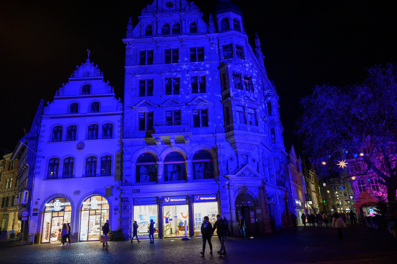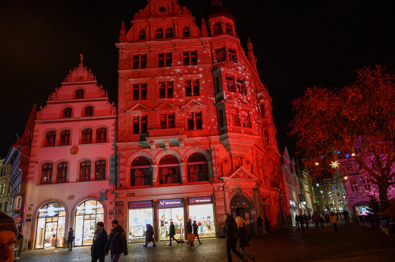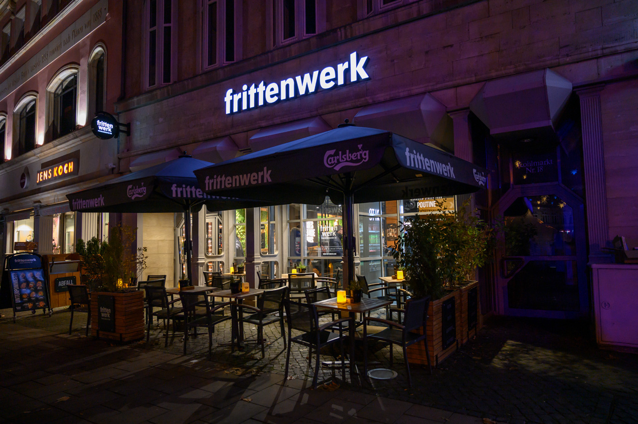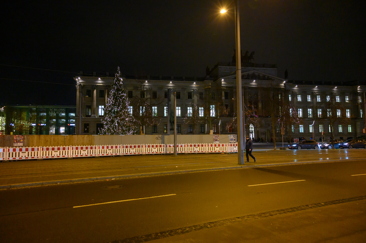 Gegen Mittag waren wir beide im Kaufland und haben uns mit frischen Lebensmitteln versorgt. Gegen 17:00 Uhr sind wir dann mit der Straßenbahn wieder zum Rathaus gefahren. Hier war es, wie erwartet, erheblich voller als gestern im Hellen. Es ist aber auch einfach schöner einen Weihnachtsmarkt im Dunkeln zu erleben. Jetzt sind sogar die Bäume beleuchtet. Wir haben aber sehr schnell gemerkt, dass es uns schon zu voll war und wir haben uns auch sehr schnell entschieden, hier auf dem Weihnachtsmarkt nichts zu essen. Ich erinnerte mich an Frittenwerk am Kohlmarkt und Susanne war schnell einverstanden. Wir haben dort sehr lecker gegessen, im Warmen und konnten dabei ordentlich an einem Tisch sitzen. Danach haben wir die Deutsche Bank geplündert und uns mit Bargeld ausgestattet.