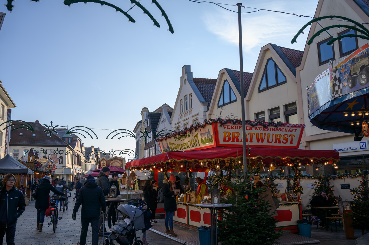 Nach einem schönen Kaffee und meinem Würstchen habe ich mit Hella telefoniert. Sie wird auf jeden Fall morgen kommen und ob Karin und Jenny mitkommen, lässt sie uns noch wissen. Nach dem Telefonat haben wir einen Spaziergang in die Altstadt von Verden gemacht. Diese kleine Stadt hat sich wieder sehr schön weihnachtlich herausgeputzt. Den Hachez laden, den wir von einem früheren Aufenthalt kannten, gibt es nicht mehr. Eigentlich nur gut für unsere Hüften. Der relativ nahe Bäcker hat auch am Sonntag geöffnet. Mit dieser Info konnten wir wieder zurück zum Womo.