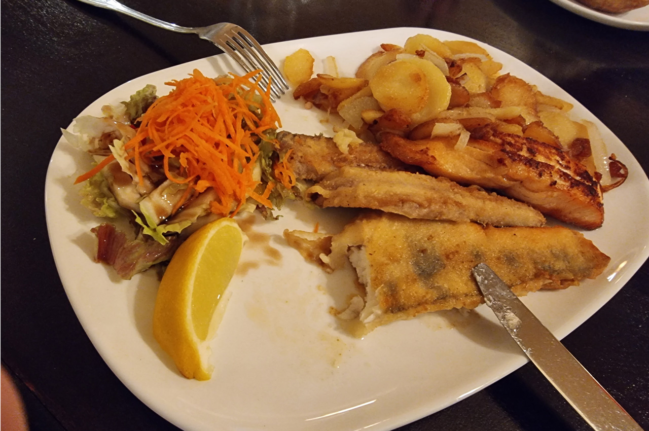 zum Abend sind wir in die Gaststätte von der Erlebniswelt gegangen und haben jeder eine Fischplatte gegessen. Susanne mit Kartoffel und Sourcreme. Die Fischplatte war sehr lecker und reichhaltig. Das Essen hier ist genau unsere Kragenweite.