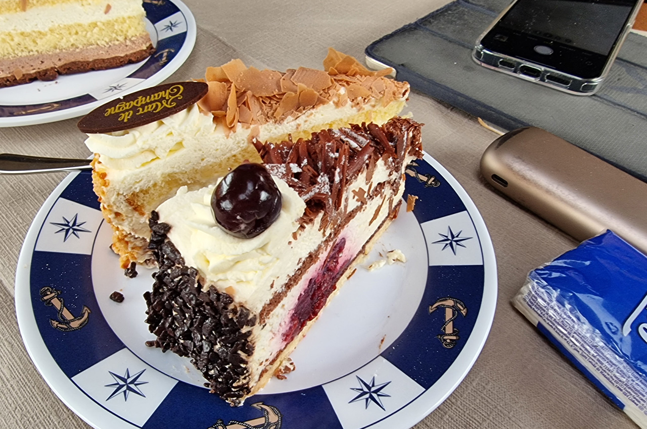 Nach einem Kaffee und meinem obligatorischen Wiener Würstel, habe ich mich nochmals auf den Weg gemacht. Mir fehlten einfach Schritte und das Wetter lockte mich in die Natur. Ich bin zur Trave gelaufen und an ihrem Ufer bis zum alten Hafen von Gothmund gegangen. Von da aus wurde es etwas abenteuerlich, da die Googlekarte die kleinen Wander- und Waldwege nicht darstellt. Nach einer kurzen Walddurchquerung landete ich wieder auf der Hauptstraße, auf der die Buslinie 12 langfährt, dass ist die Linie mit der wir immer in die Altstadt fahren. Nun bin ich diese Straße weiter gelaufen bis zur Hülshorststraße, in der auch der Stellplatz ist. Kurz vor Ankunft rief Susanne an, sie hat mich schon vermisst. Der kleine Spaziergang brachte ca. 11.000 Schritte auf meiner Fitnesuhr. Das reichte dann aber auch. Im Womo gab es einen leckeren Kaffee mit einem Stück Kuchen.