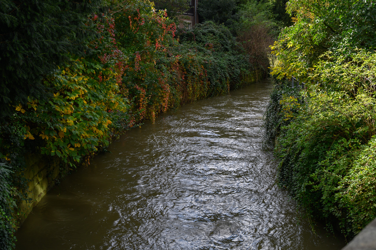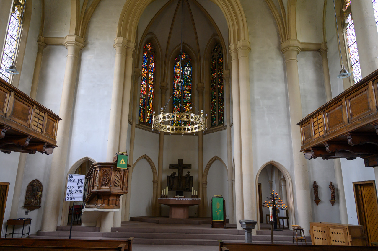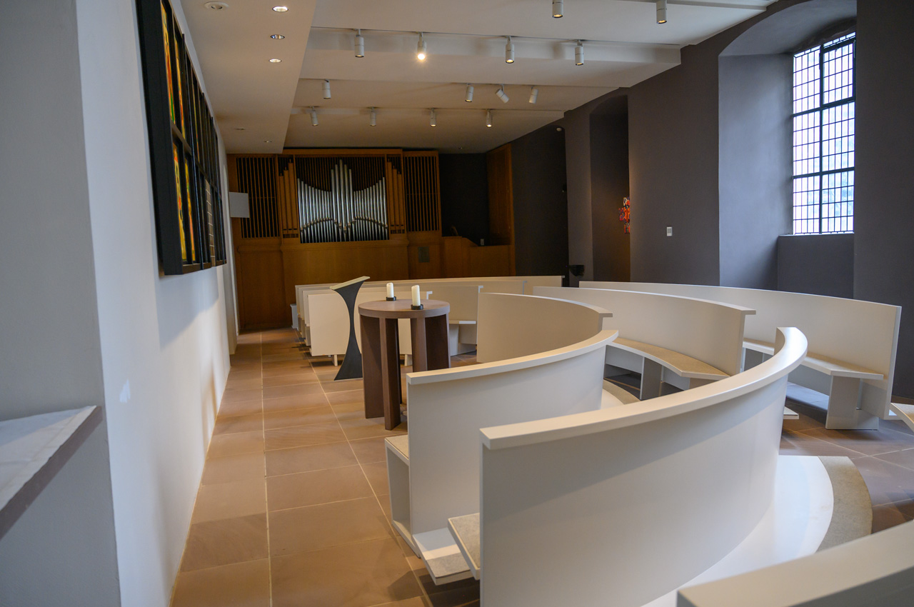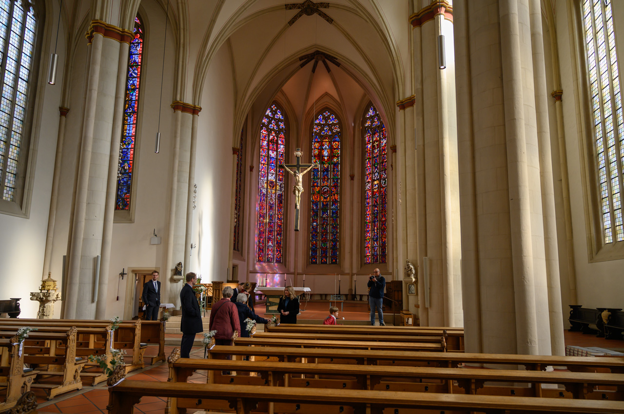 Gegen Mittag bin ich zu einem größeren Spaziergang gestartet. Der Weg sollte das Ziel sein und so bin ich einfach immer entlang dem Ufer gelaufen, vorbei an vielen kleinen Einfamilienhäusern mit ausgesprochen gepflegten Gärten und immer wieder Blicke auf das Wasser. Die Maas hat hier viele Seitenarme, Kanäle und seenartige Erweiterungen. Wasser ist einfach allgegenwärtig. Ich gebe zu, dass ich mich bei diesem Spaziergang an vielen Stellen an unsere schöne Zeit mit der Selektra erinnert habe. Ich bin fast einmal um Herten herumgelaufen und bei der Rückkehr dann quer durch. Dabei habe ich den Weg zum Bäcker nachvollzogen und konnte einen Blick in die Kirche H. Michael werfen. Man kann von einer Seitenkapelle durch ein Gitter in das Kirchenschiff schauen.