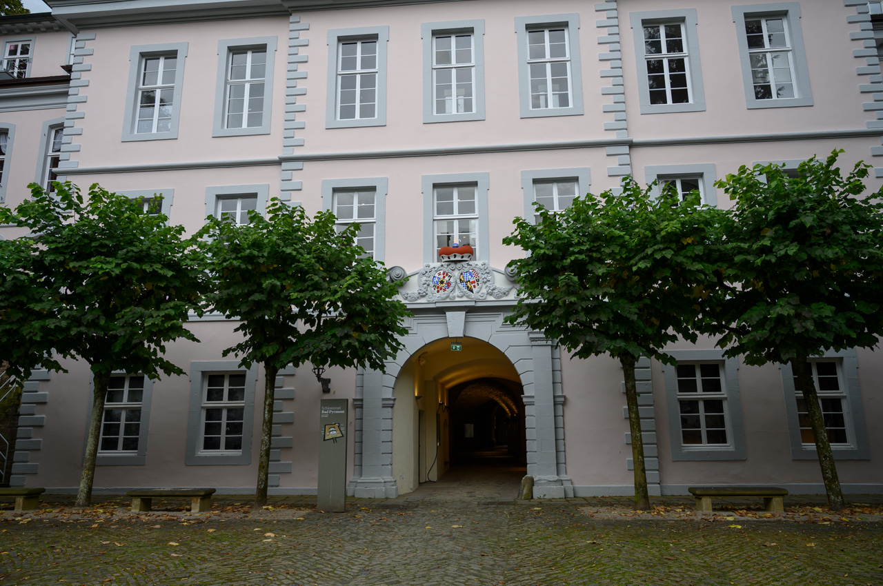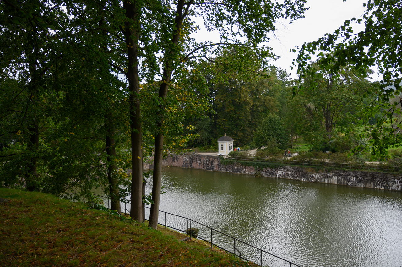 Gegen 13:00 Uhr habe ich mich dann nicht mehr von dem Wetterbericht und dem düsteren Himmel beirren lassen. Ich habe mich einfach auf den Weg gemacht, mit einem Regenschirm bewaffnet. Mein erstes Ziel war das Schloss. Auf dem Weg dahin bin ich an vielen Villen vorbeigekommen, die mal im wilhelminischen Stil erbaut wurden und die ich eher von der Ostseeküste her kenne. Das Problem, die Villen, alles ehemalige Pensionen mit hochtrabenden Namen, stehen leer. Sieht so aus, als ob sie dem Verfall preisgegeben sind. Dieser Anblick hat meinen Eindruck vom Verfall dieses Ortes nur noch verstärkt. Das Schloss oder besser die Festungsanlage ist von der Lage und dem Äußeren sehr eindrucksvoll, aber es gibt nicht mehr wirklich viel zu sehen, weil die Gebäude vordergründig für Veranstaltungen genutzt werden und das Museum hauptsächlich von wechselnden Ausstellungen gefüllt wird. In dem Festungsgraben der Anlage wimmelt es nur so von richtig dicken Karpfen. Man könnte fast vermuten, da sind ein paar zu viel drinnen. Das Wasser ist auch eine ziemlich trübe Suppe. Nach dem Verlassen der Festungsanlage, habe ich in einem großen Bogen den Kurpark umrundet durch das nördliche Parkgelände der großen Reha-Kliniken. Hier sieht es schon alles etwas lebendiger aus, obwohl auch hier eine Klinikruine vor sich hin rottet. Am Brunnenplatz in der Wandelhalle, hatte ich gestern leckere Torten in dem Cafe gesehen. Da habe ich drei Stück gekauft, für unseren Nachmittagskaffee. Als ich die Wandelhalle verlassen habe, fing es ziemlich kräftig an zu regnen. Gut, dass ich den Schirm dabei hatte. Jedenfalls habe ich die Tortenstücke trocken und weitestgehend unbeschadet zum Womo gebracht. Hat sich gelohnt, denn die waren richtig lecker.